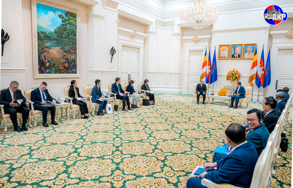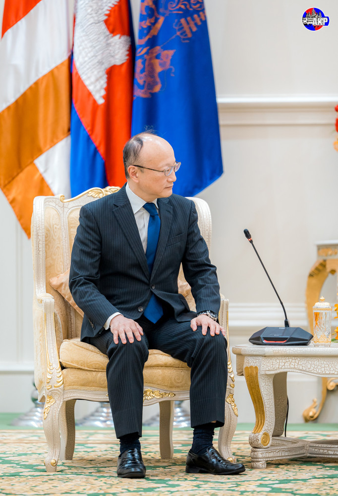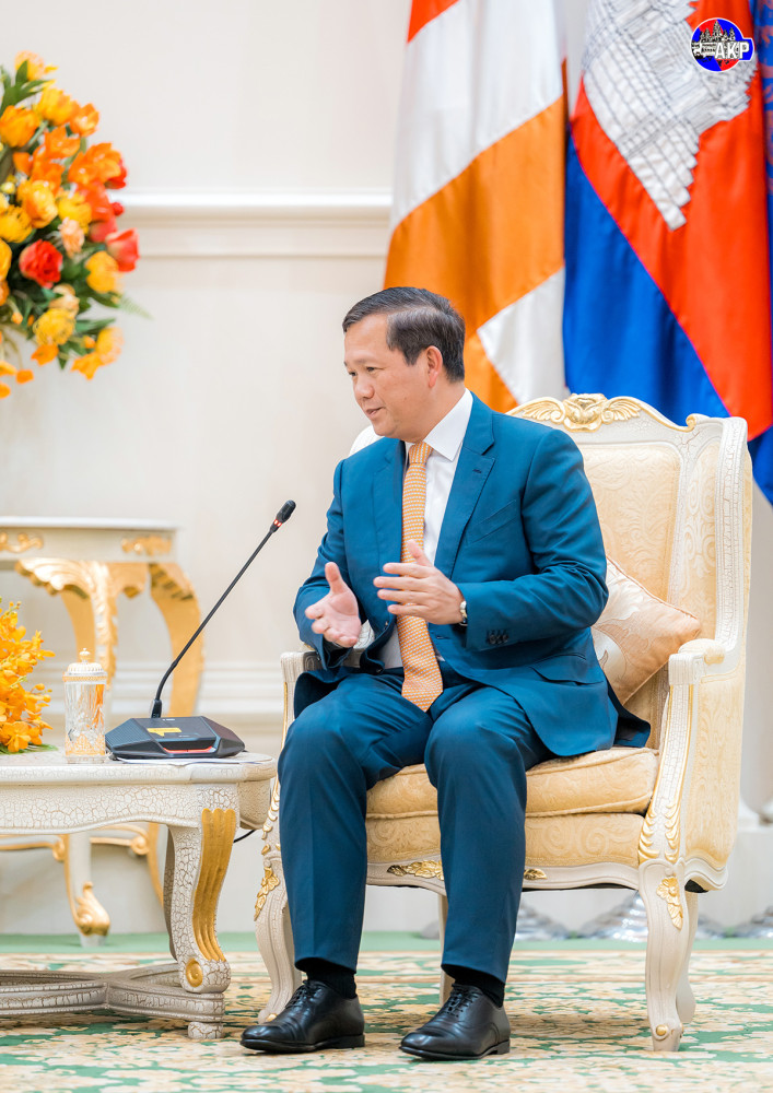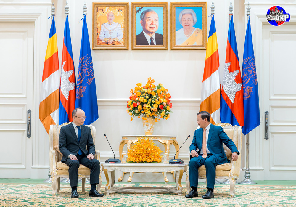 Samdech Moha Borvor Thipadei Hun Manet (Pic. 1), Prime Minister of the Kingdom of Cambodia, shakes hands with visiting H.E. Masato Kanda, President of the Asian Development Bank (ADB), prior to their courtesy meeting at the Peace Palace here this afternoon.