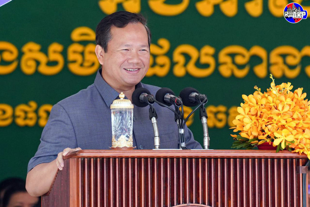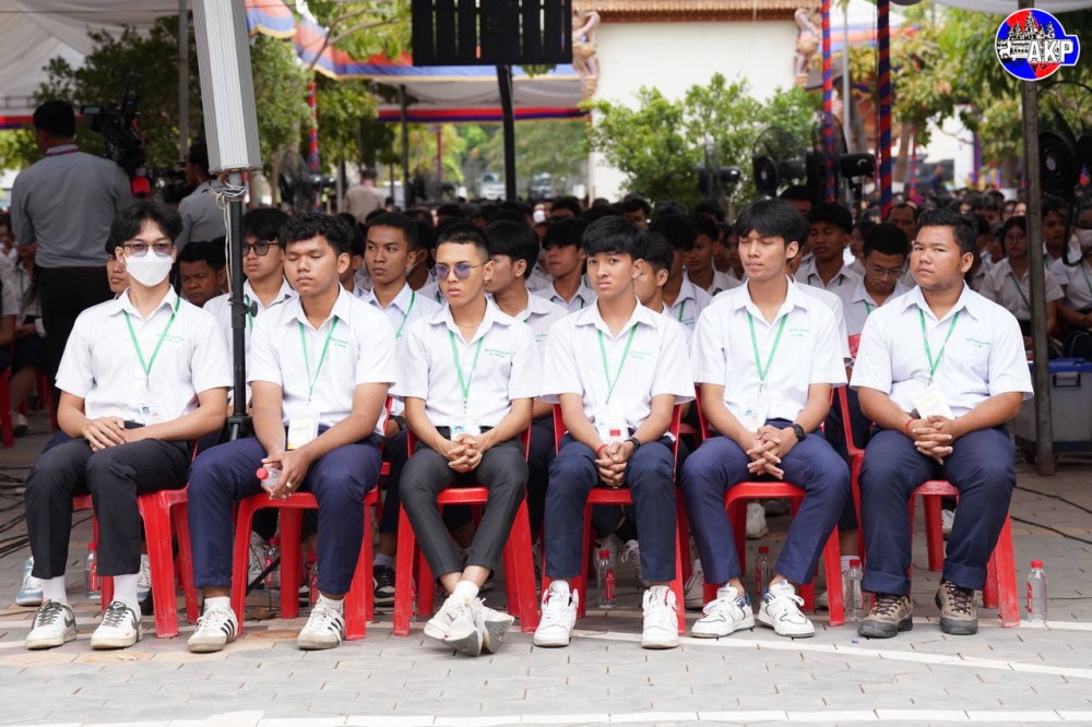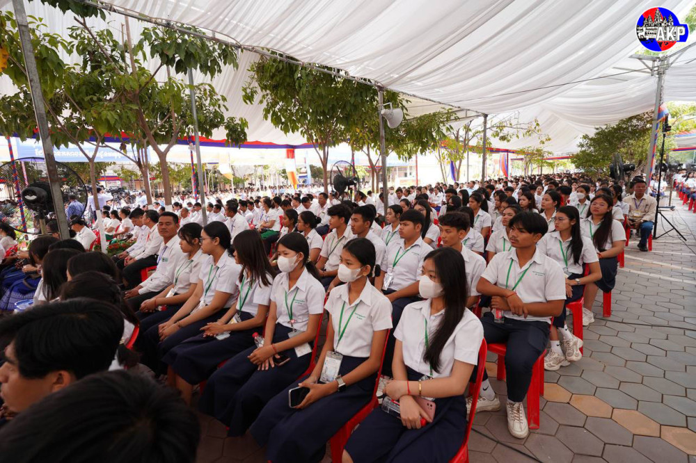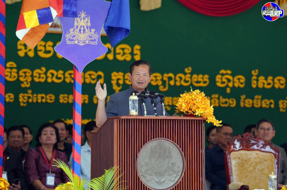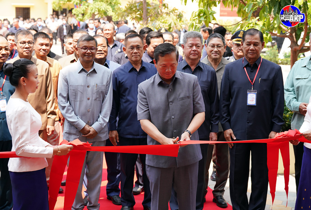 Samdech Moha Borvor Thipadei Hun Manet (Pic. 1), Prime Minister of the Kingdom of Cambodia, addresses the participants while he was presiding over the inauguration ceremony of a school building together with the attached achievements at Hun Sen Sereypheap (Freedom) high school in Takhmao town, Kandal province this morning.