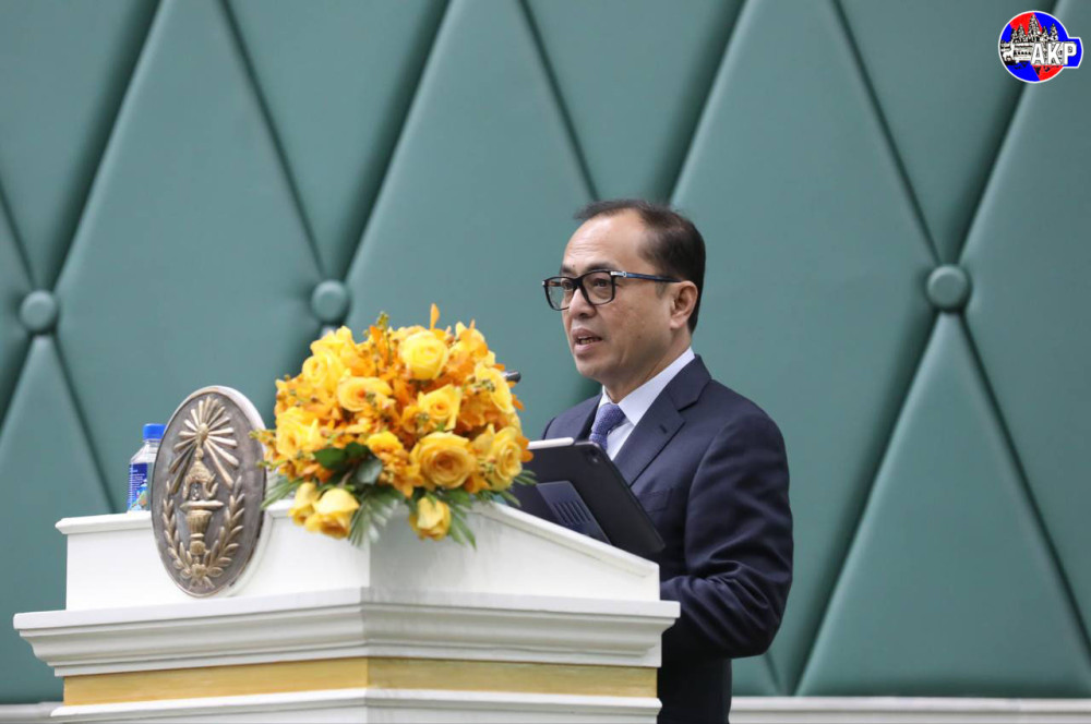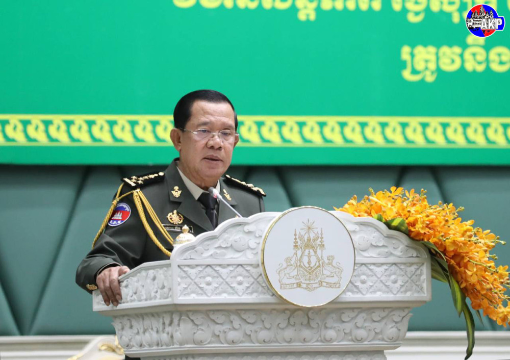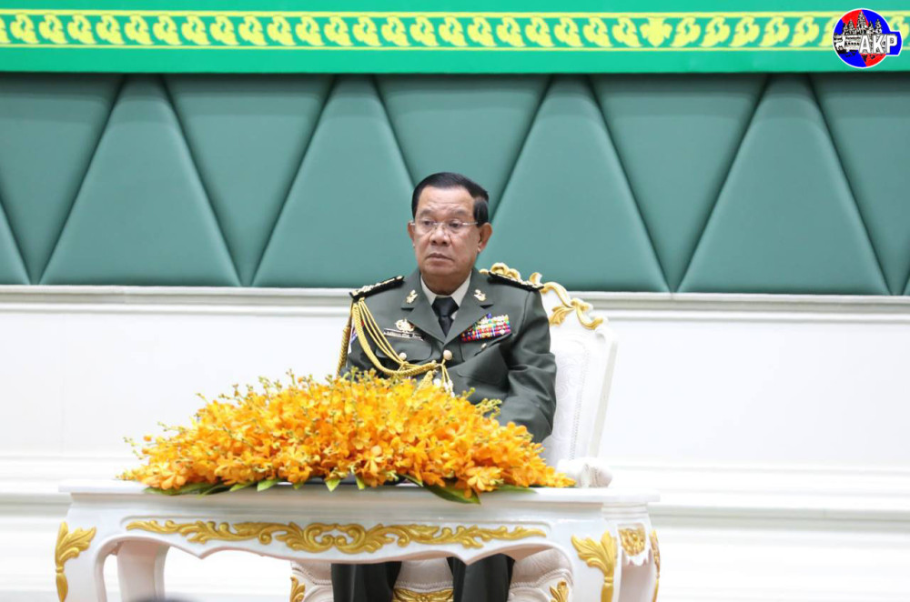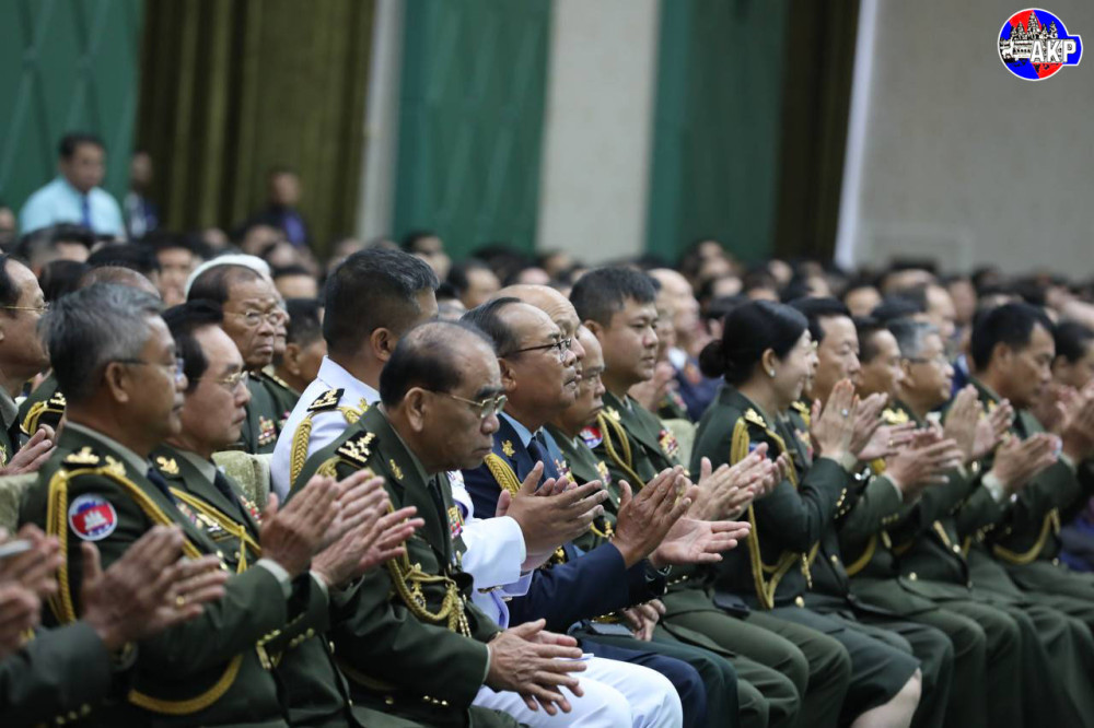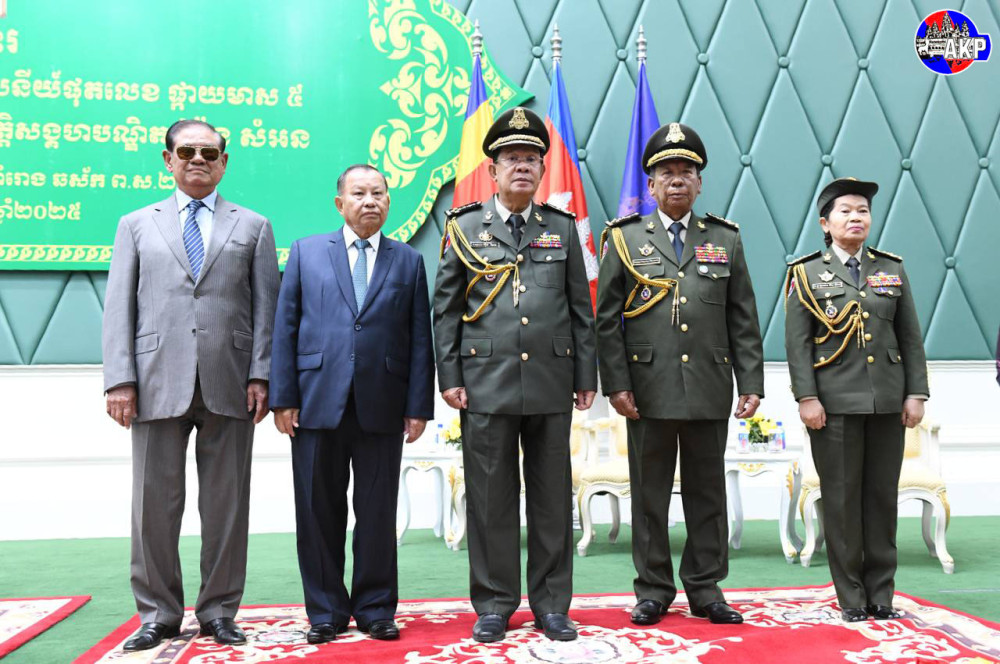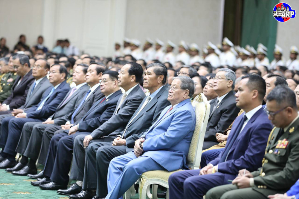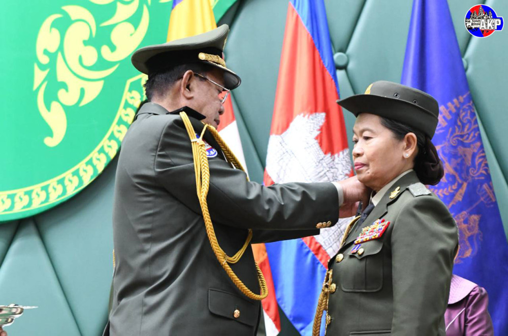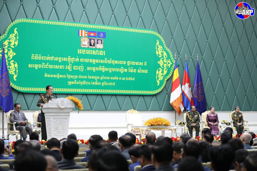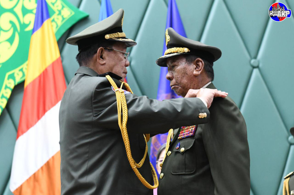 Samdech Akka Moha Sena Padei Techo Hun Sen (Pic. 1), Acting Head of State of the Kingdom of Cambodia, presides over a ceremony to confer the five-star general rank upon two members of the Supreme Privy Council Members to His Majesty the King – Samdech Pichey Sena Tea Banh and Samdech Kitti Sangahapundit Men Sam An, at the Peace Palace in Phnom Penh this morning.