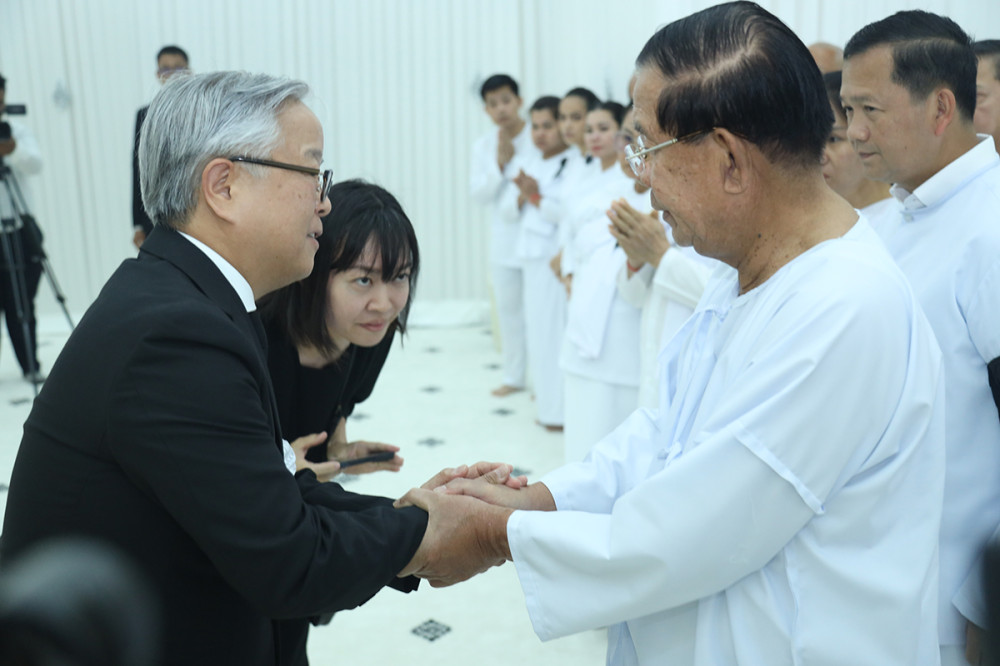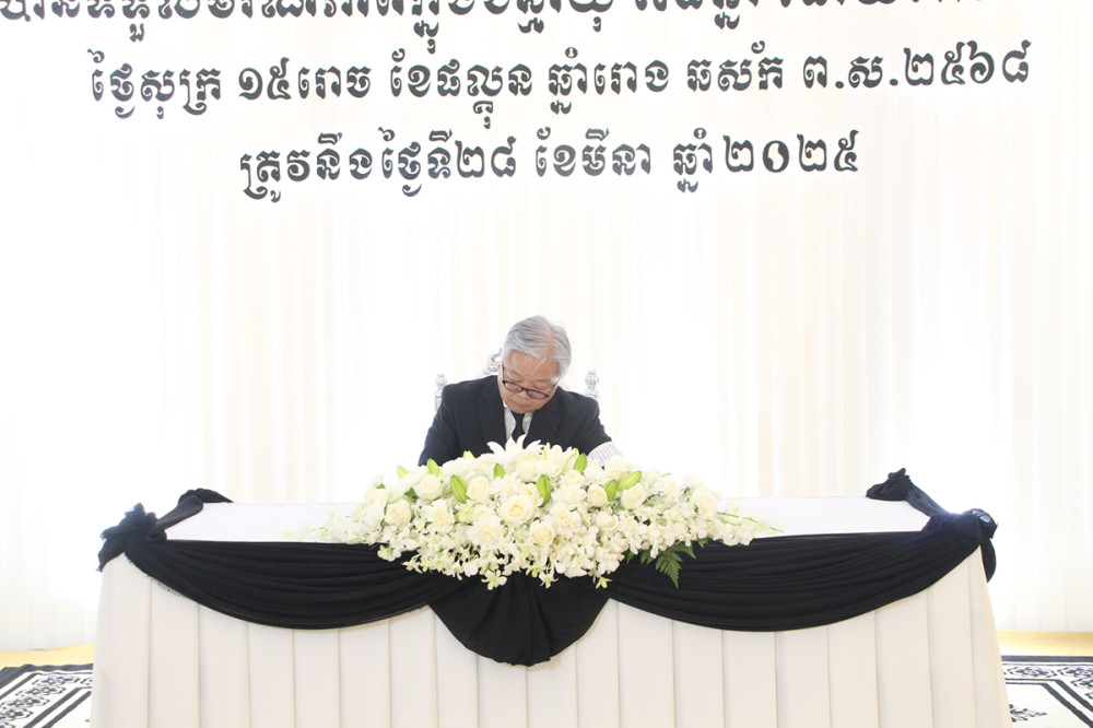 H.E. Ueno Atsushi, Ambassador of Japan to Cambodia, pay his last respects to late H.E. Neak Oknha Oudom Metreivisidh Hun San, Secretary of State at the Ministry of Public Works and Transport, who passed away in Phnom Penh at 2:27 am on Mar. 28, at the age of 78 due to illness.