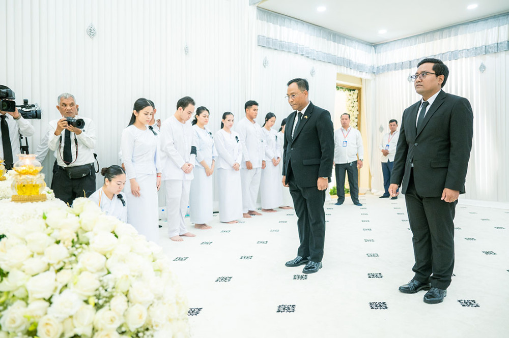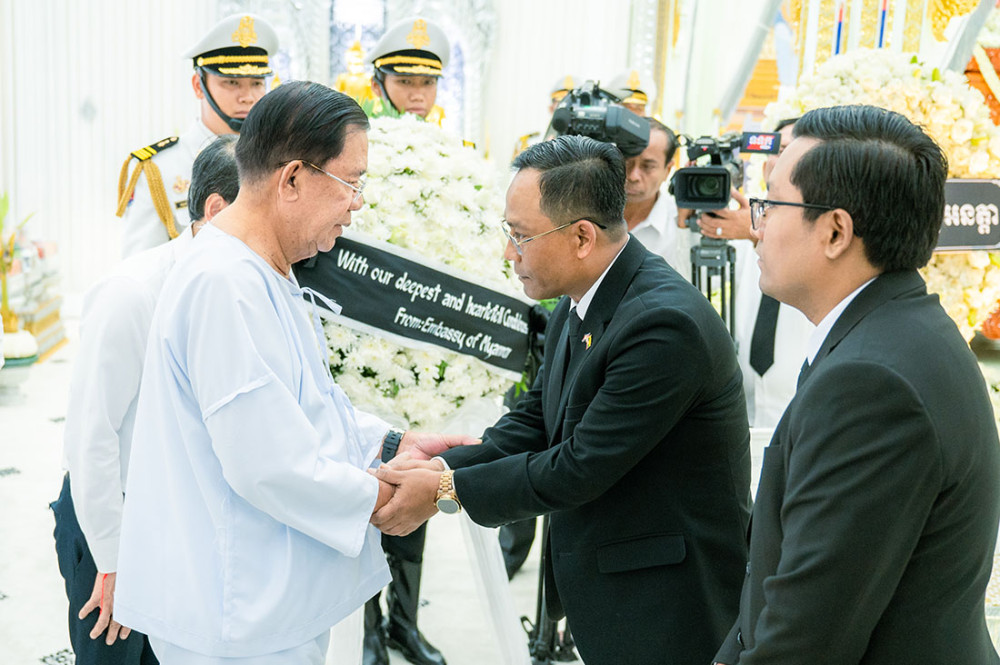 H.E. Kyaw Soe Min (L Front, Pic. 1), Ambassador of Myanmar to Cambodia, pays his last tribute here this afternoon to late H.E. Neak Oknha Oudom Metreivisidh Hun San, Secretary of State at the Ministry of Public Works and Transport and the eldest brother of Samdech Techo Hun Sen, Acting Head of State of Cambodia, who passed away on Mar. 28, at the age of 78 due to illness.
