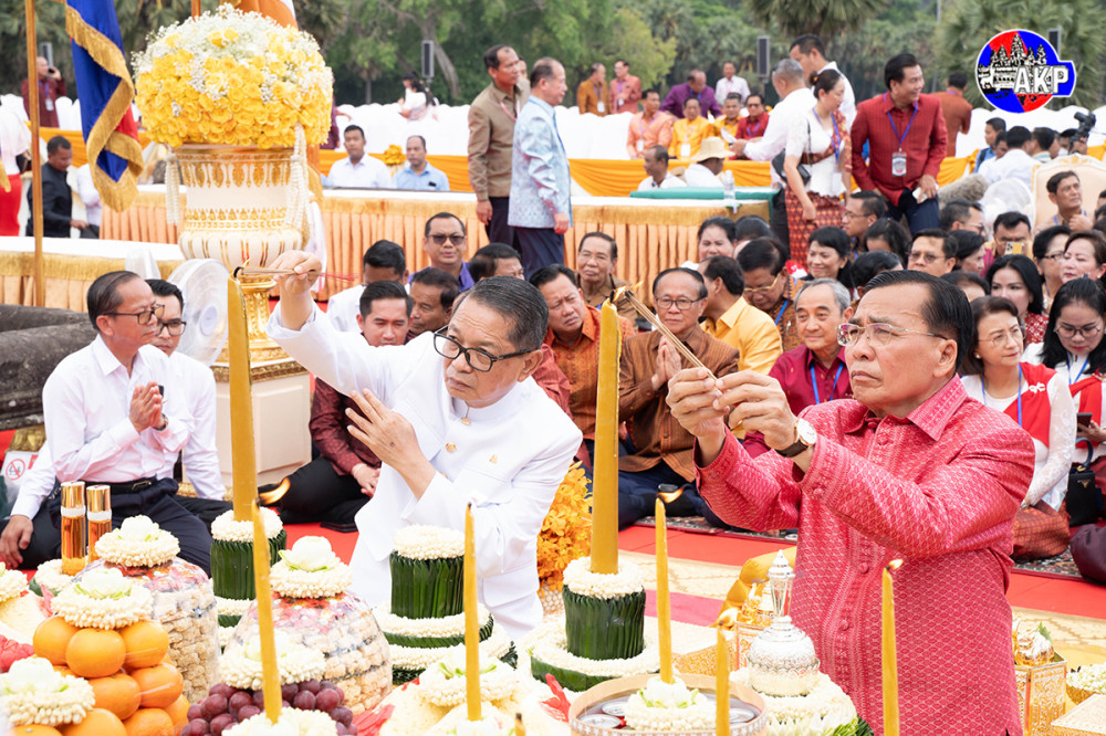 Samdech Moha Montrei Kuy Sophal (Pic. 1), Deputy Prime Minister, Minister of the Royal Palace and Chairman of the National Committee for Organising National and International Festivals, lights a candle while he was chairing a Prong Porli or Krong Porli religious ceremony in front of the Angkor Wat Temple in Siem Reap province this afternoon, ahead of the Royal Prayer Ceremony for the Prosperity of the Kingdom of Cambodia, to be held at the same place tomorrow.
