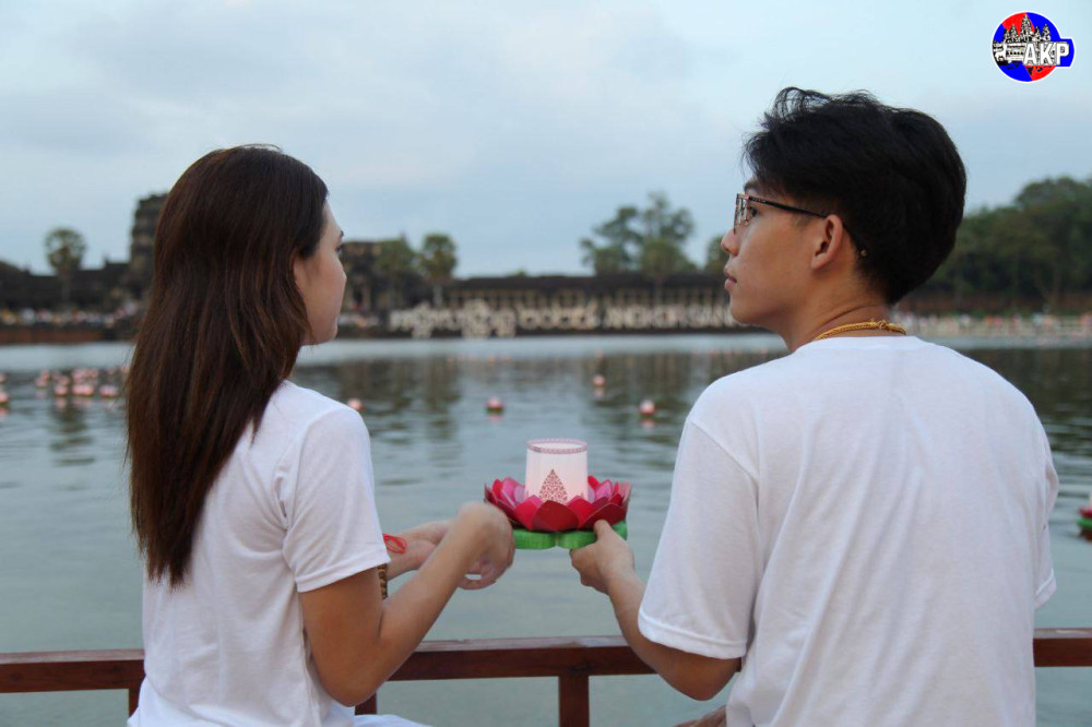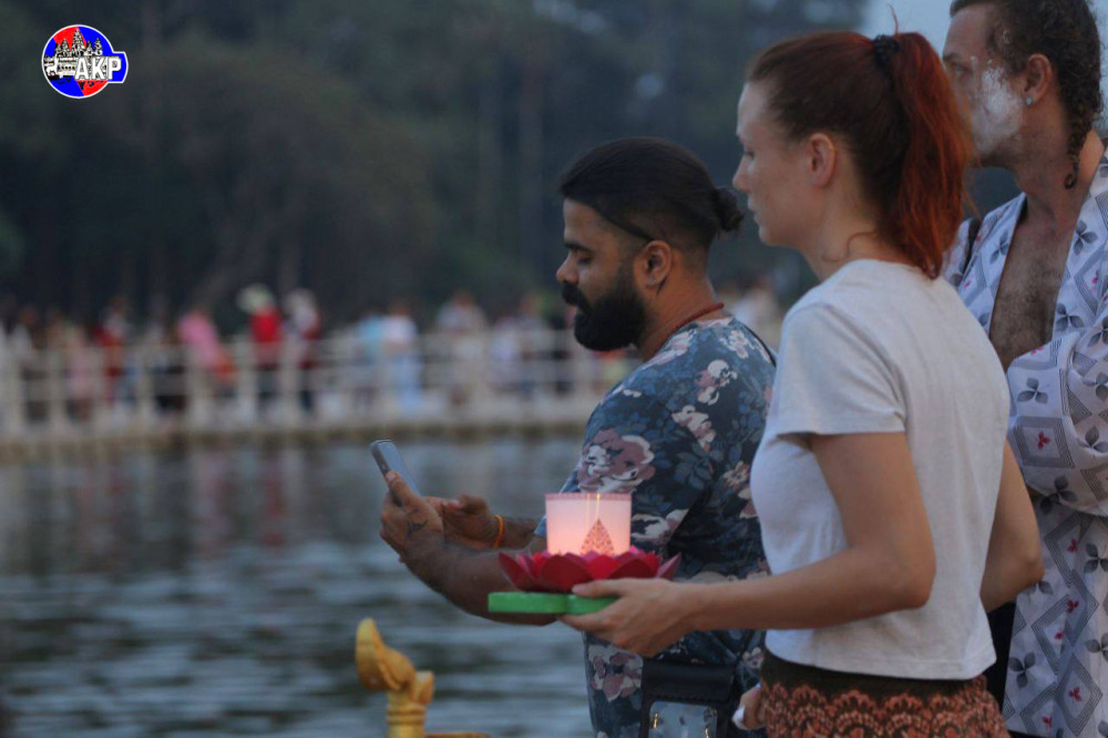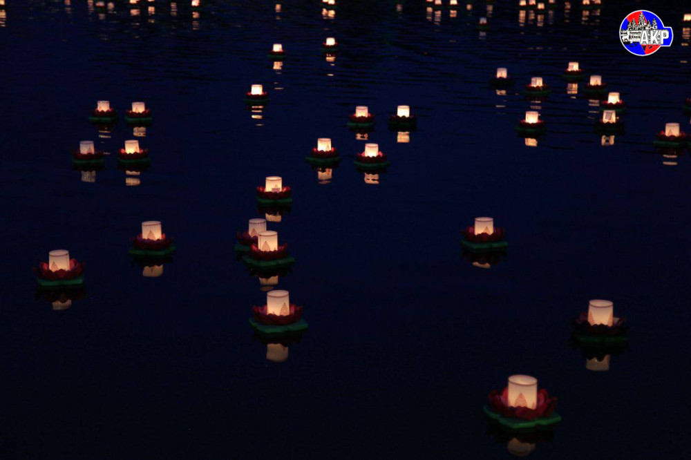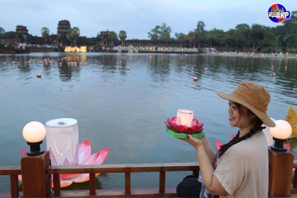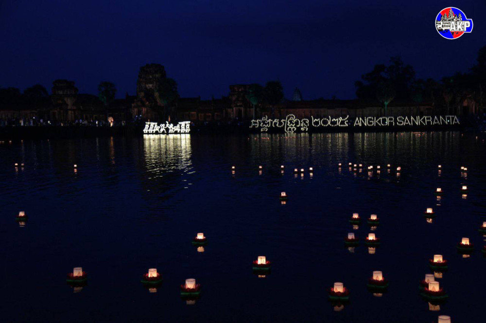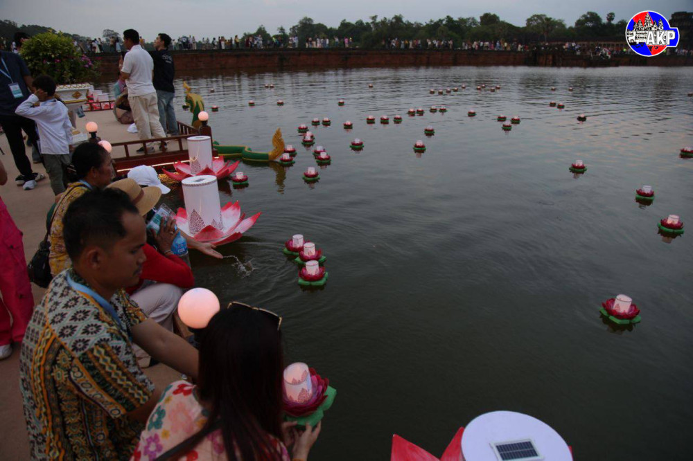A large number of national and international tourists and local residents participate in a lantern floating ceremony, at the Angkor Wat Temple complex in Siem Reap provincial city this evening, the second day of the three-day Angkor Sankranta 2025.