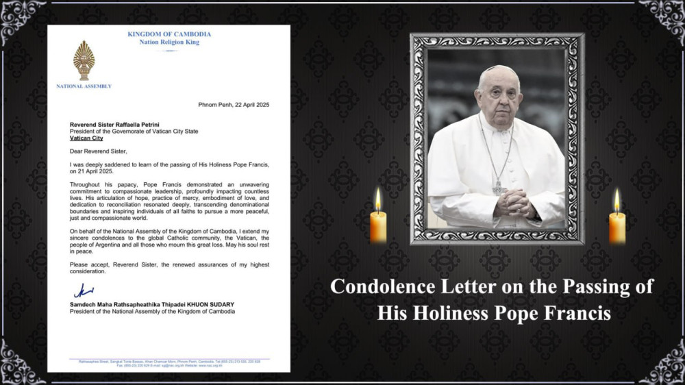 Samdech Maha Rathsapheathika Thipadei Khuon Sudary, President of the National Assembly of Cambodia, has sent a condolence message to Reverend Sister Raffaella Petrini, President of the Governorate of Vatican City State, over the passing of His Holiness Pope Francis.