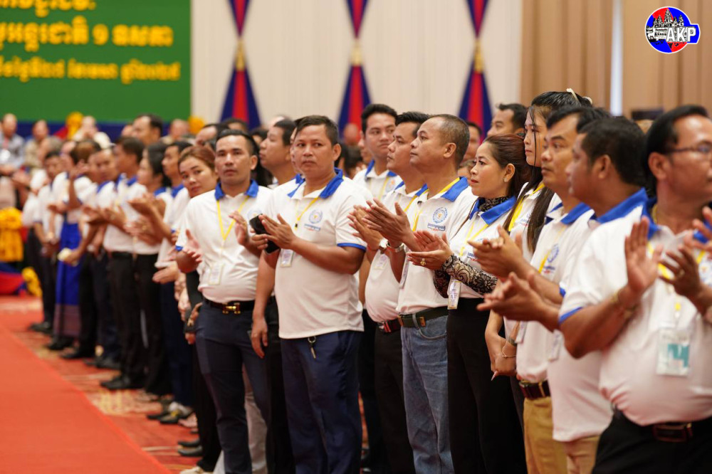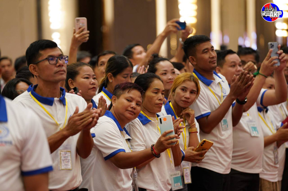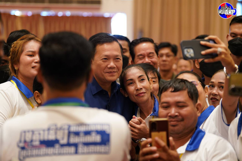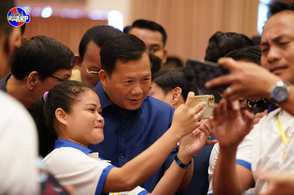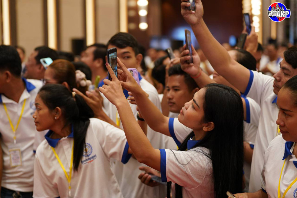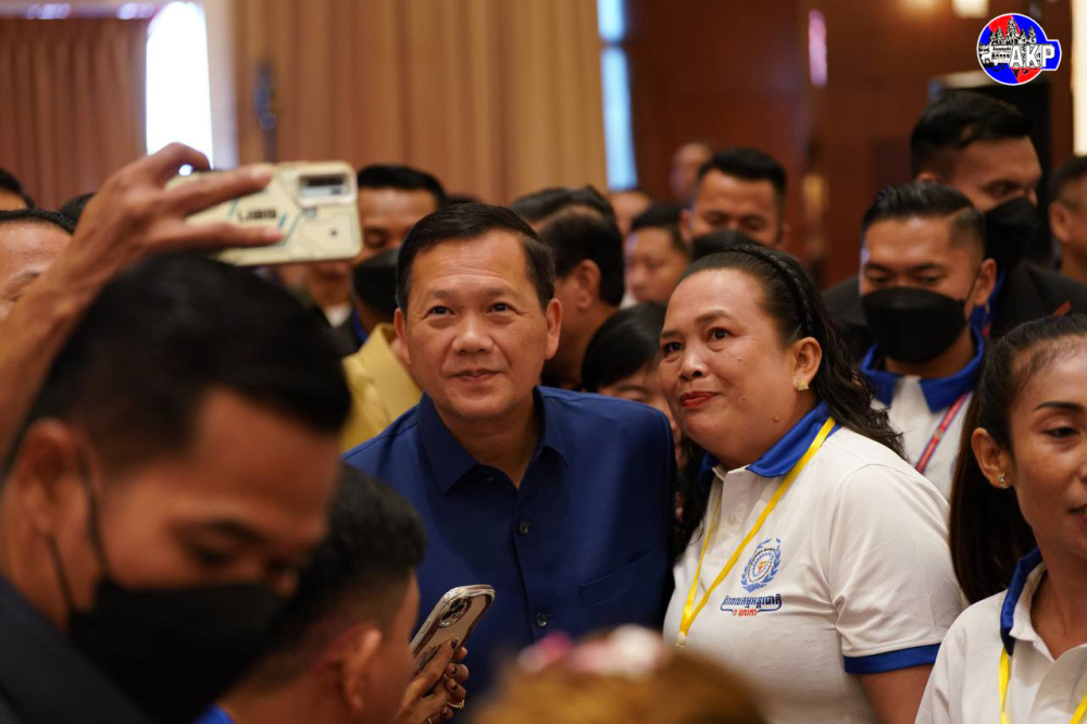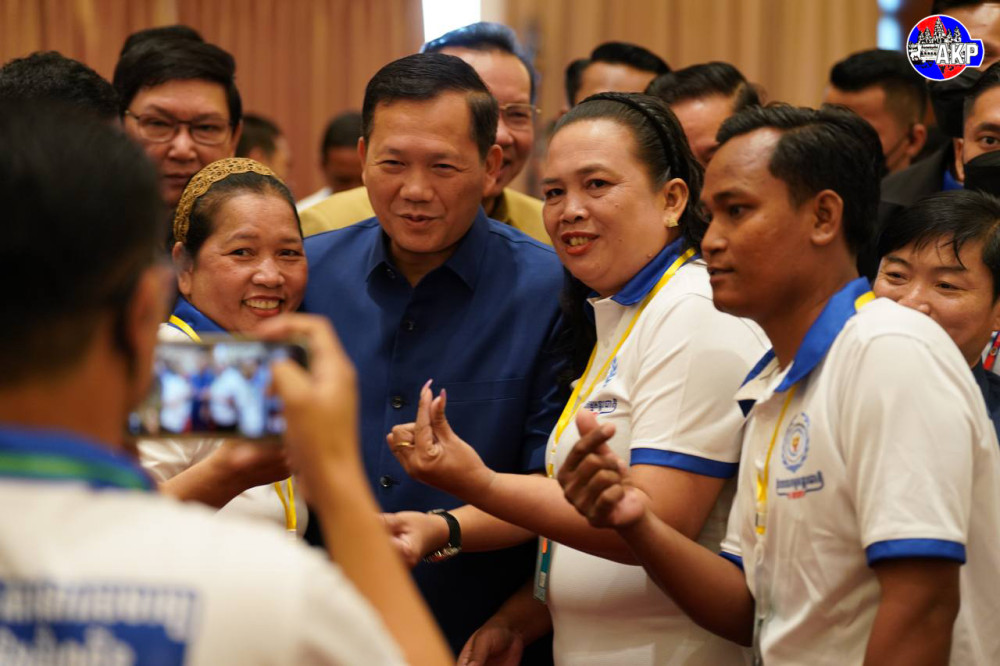 Prime Minister Samdech Moha Borvor Thipadei Hun Manet is warmly greeted by members of the informal economy unions and academic staff associations, upon his arrival for a get-together with them at Chroy Changvar International Convention and Exhibition Centre in Phnom Penh this morning.