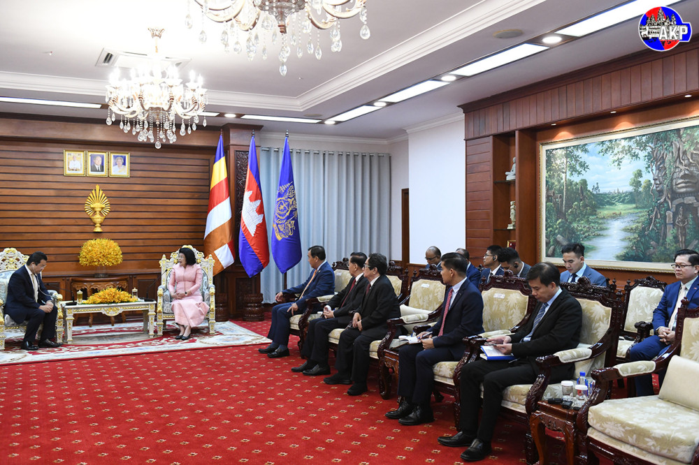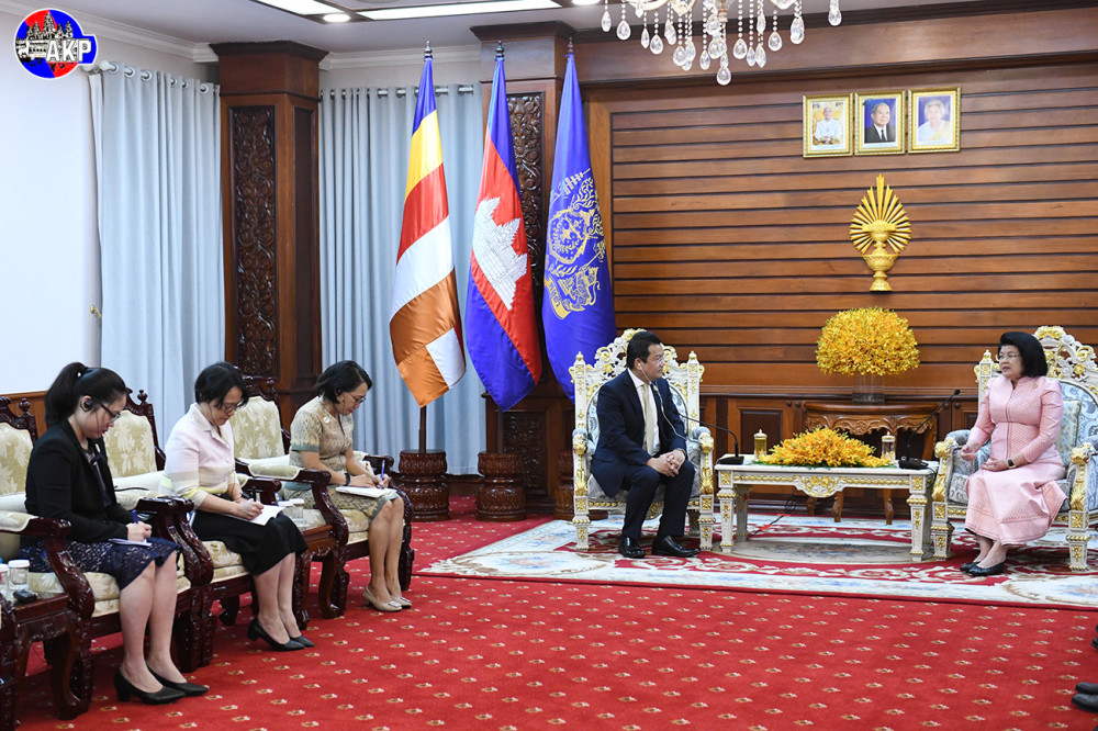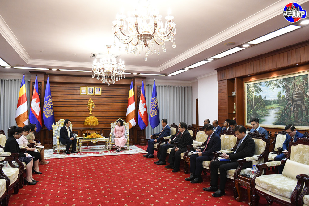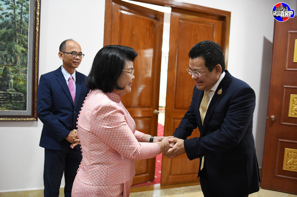 Samdech Maha Rathsapheathika Thipadei Khuon Sudary (L, Pic. 1), President of the National Assembly (NA) of Cambodia, greets H.E. Tull Traisorat, newly appointed Ambassador Extraordinary and Plenipotentiary of the Kingdom of Thailand to the Kingdom of Cambodia, prior to their courtesy meeting at the NA Palace here this morning.