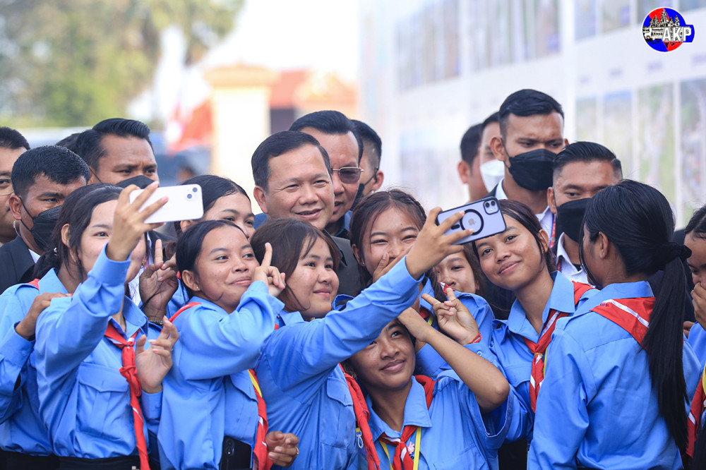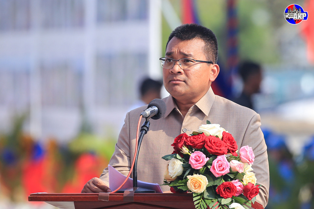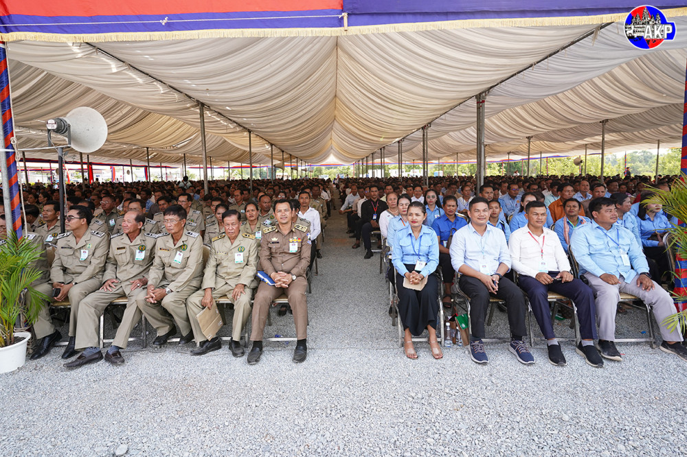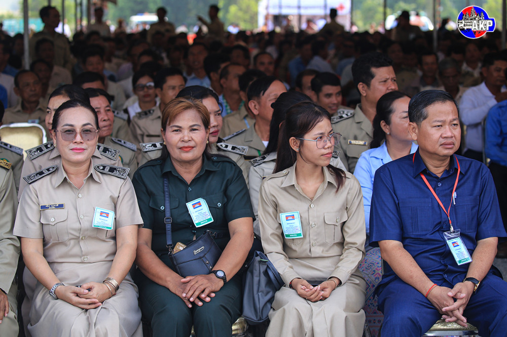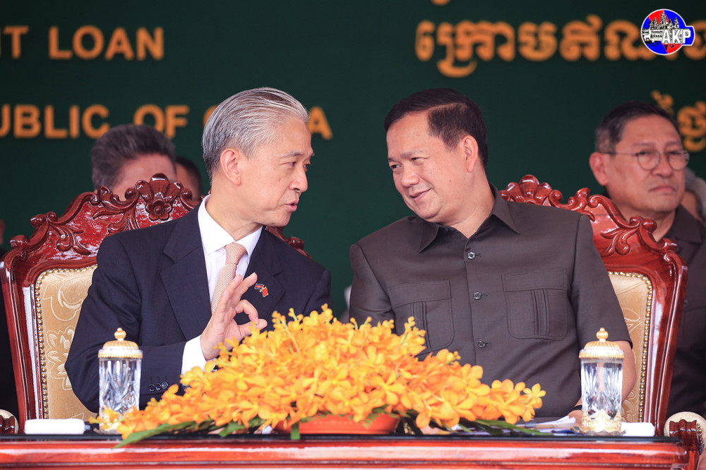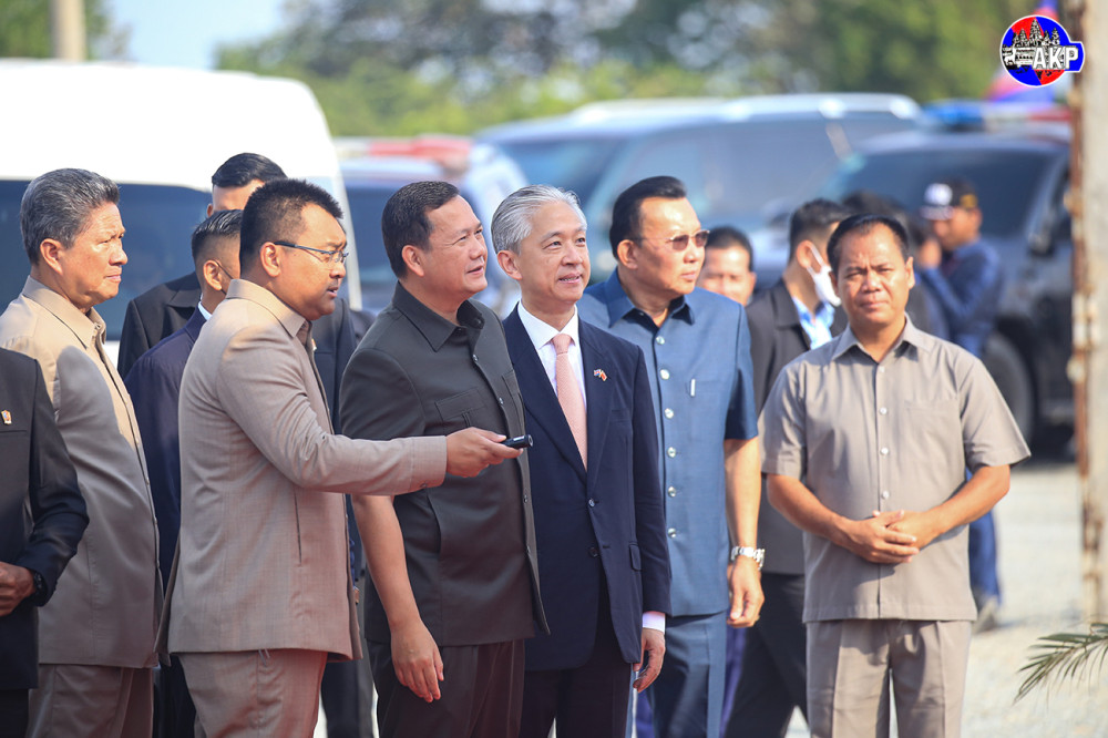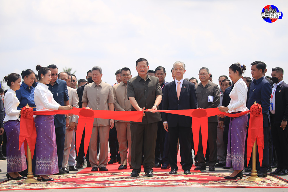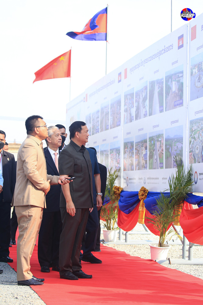 Prime Minister Samdech Moha Borvor Thipadei Hun Manet (Pic. 1) addresses the participants while he and Chinese Ambassador to Cambodia H.E. Wang Wenbin (Pic. 2) were presiding over in Trak Kak district, Takeo province this morning the inauguration ceremony of three national roads, built under a concessional loan from the Chinese government of US$188 million.