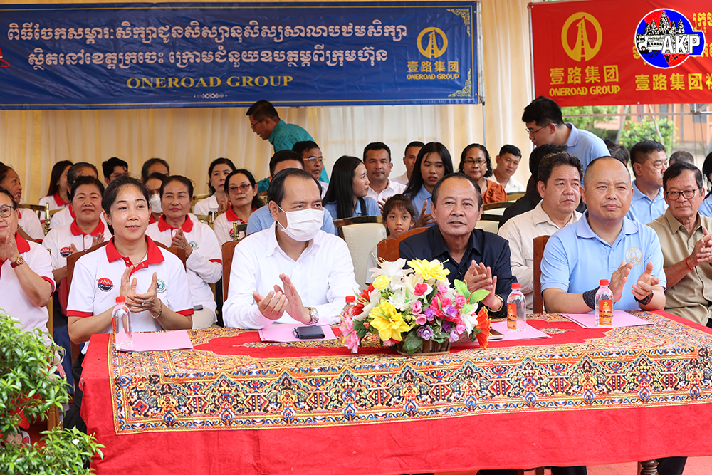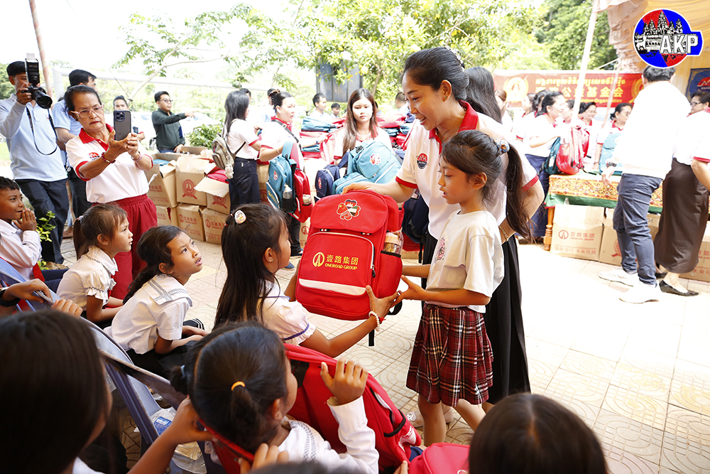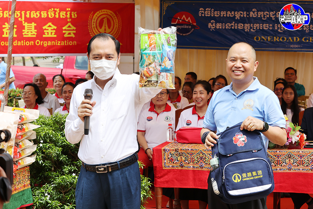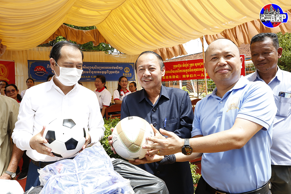 Minister of Information H.E. Neth Pheaktra (L, Pic. 1), Head of the Royal Government Working Group for Kratie province, hands over a school bag to a school pupil while he and his spouse, accompanied by their colleagues and provincial leaders and authorities were presiding over the distribution ceremony of school bags and supplies, biscuits, balls, and sportswear to some 500 primary students at a local school in Prek Prasap district, Kratie province this morning, on the occasion of the 76th International Children's Day on June 1, the 24th World Day Against Child Labour on June 12, and the Cambodian Children's Day 2025.
