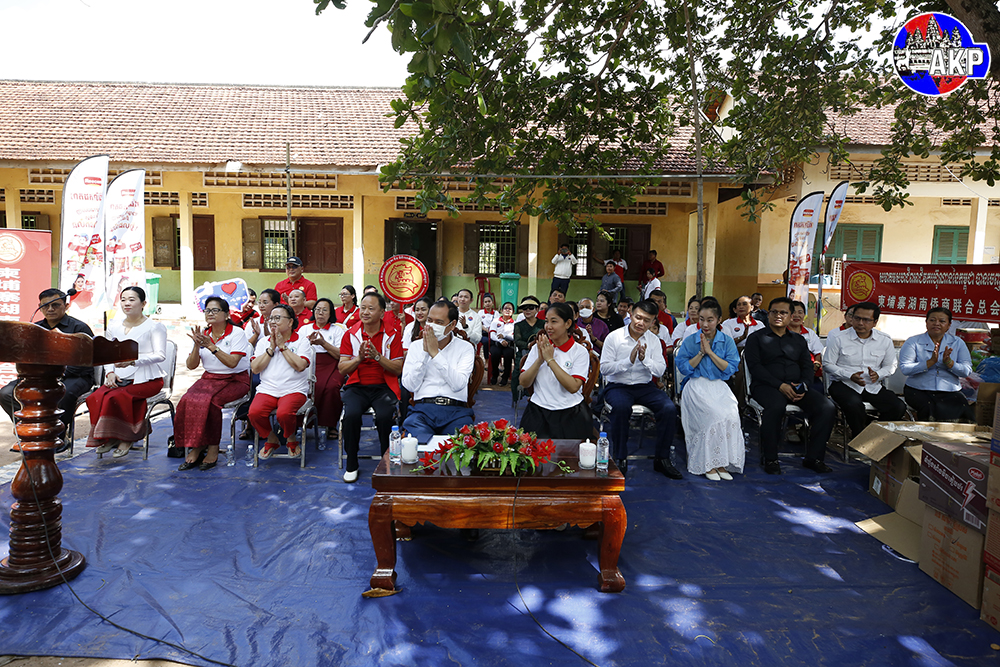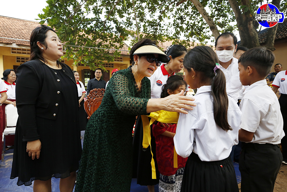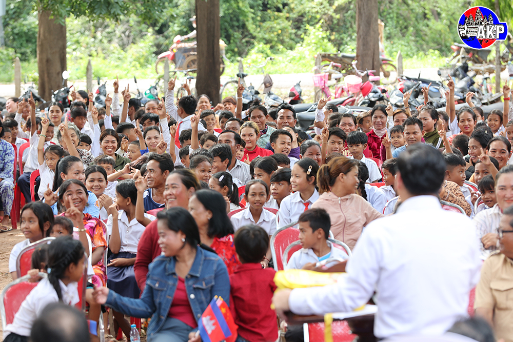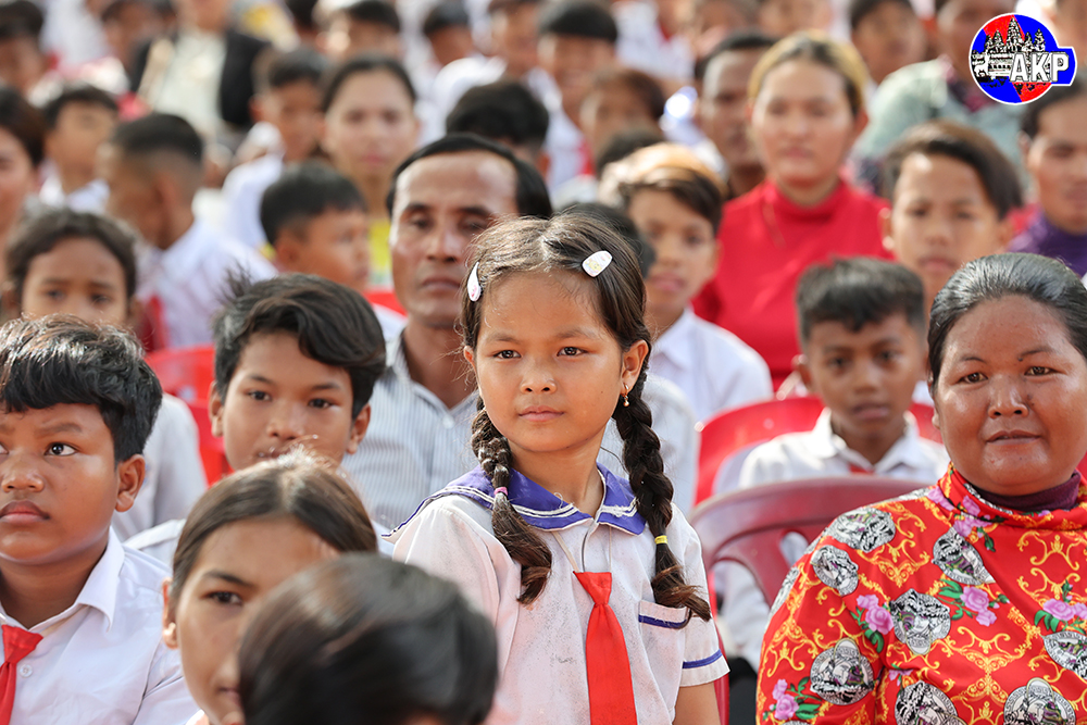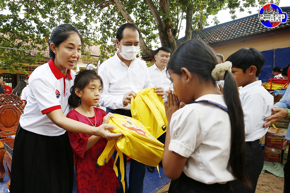 Minister of Information H.E. Neth Pheaktra (R, Pic. 1), Head of the Royal Government Working Group for Kratie province, and his spouse hand over school bags to pupils at the distribution ceremony of school bags and supplies, biscuits, etc. to some 400 students at Damrey Phong Primary school in Chlong district, Kratie province on June 1, on the occasion of the 76th International Children's Day on June 1, the 24th World Day Against Child Labour on June 12, and the Cambodian Children's Day 2025.