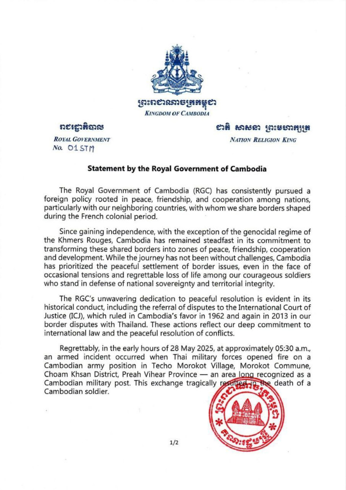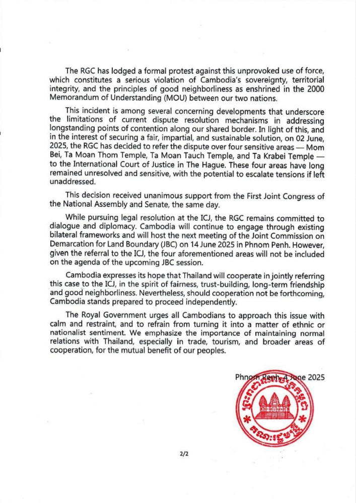 To maintain peace, good friendship, and prevent eventual war, Cambodia insists on urging Thailand to bring the “border issue” at the Mom Bei area and Ta Moan Thom, Ta Moan Tauch, and Ta Krabey Temples, to the International Court of Justice (ICJ) to ensure justice, fairness, and a lasting solution. The following is the statement by the Royal Government of Cambodia: