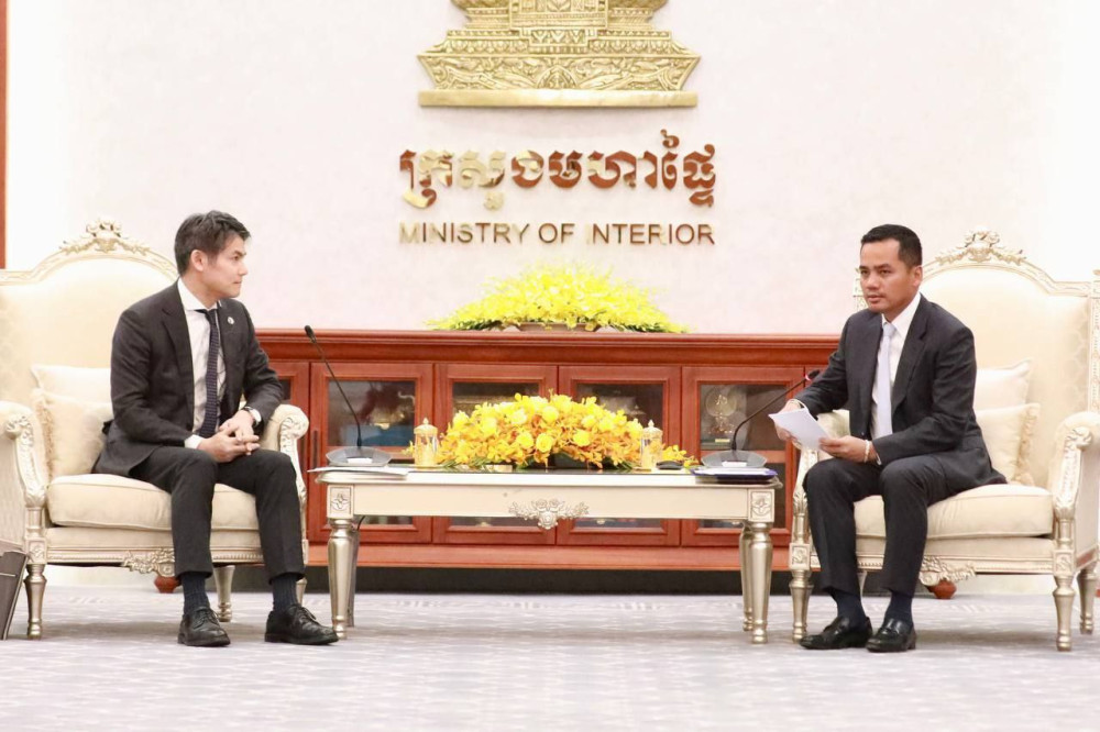 H.E. Aphi Santepundit Sar Sokha (R, Pic. 1), Deputy Prime Minister and Minister of Interior, poses for a photo with Mr. SANUI Kazumasa, Chief Representative of the Japan International Cooperation Agency (JICA) in Cambodia, at their meeting at the ministry this afternoon.