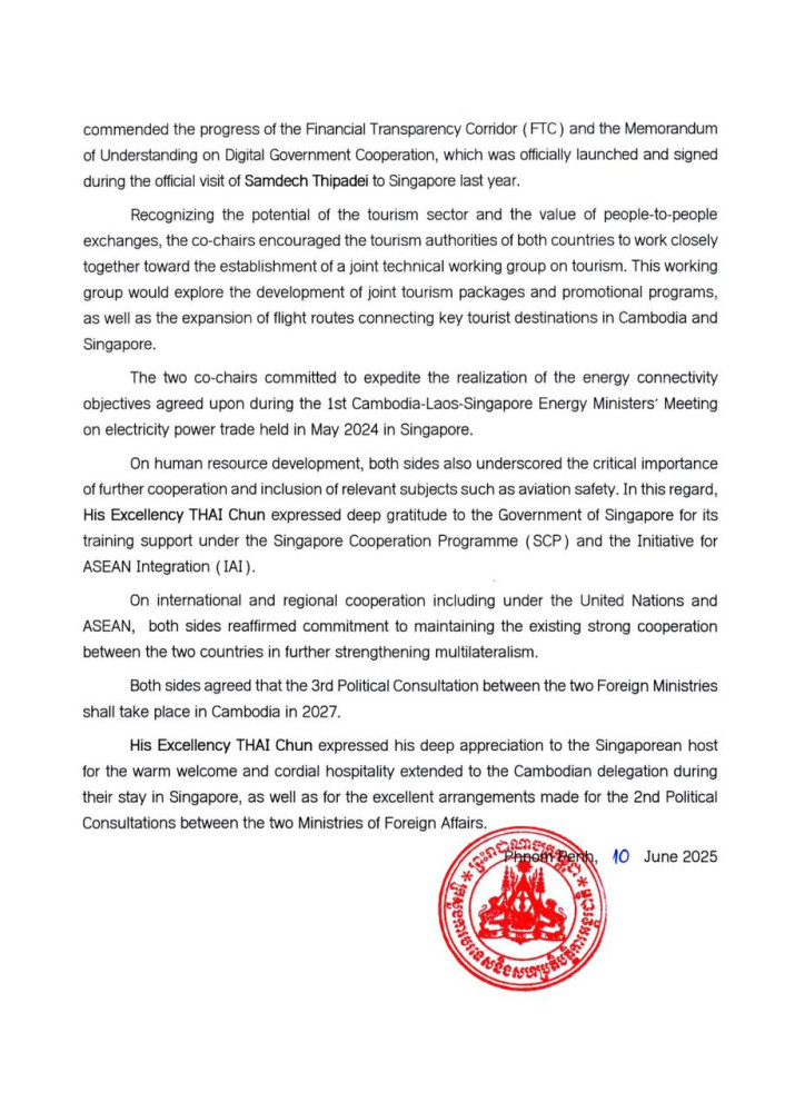 The following are the outcomes of the Second Political Consultations between the Ministry of Foreign Affairs and International Cooperation of Cambodia (MFAIC) and the Ministry of Foreign Affairs of Singapore, released yesterday evening: