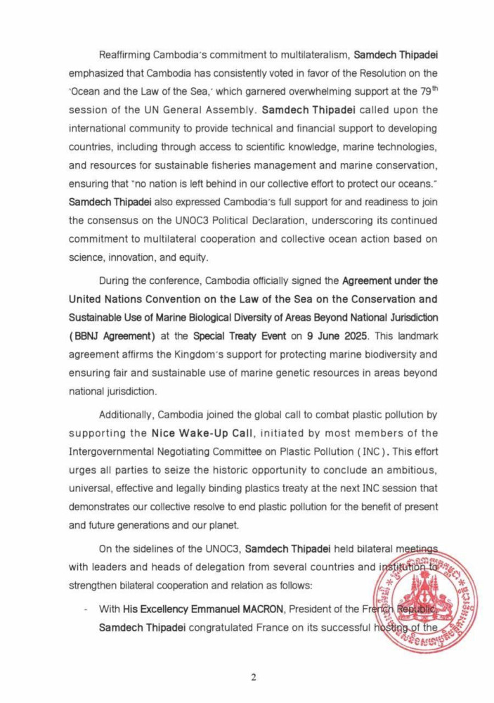 Outcomes of the Participation of Samdech Thipadei Prime Minister in the Third United Nations Ocean Conference in Nice, France