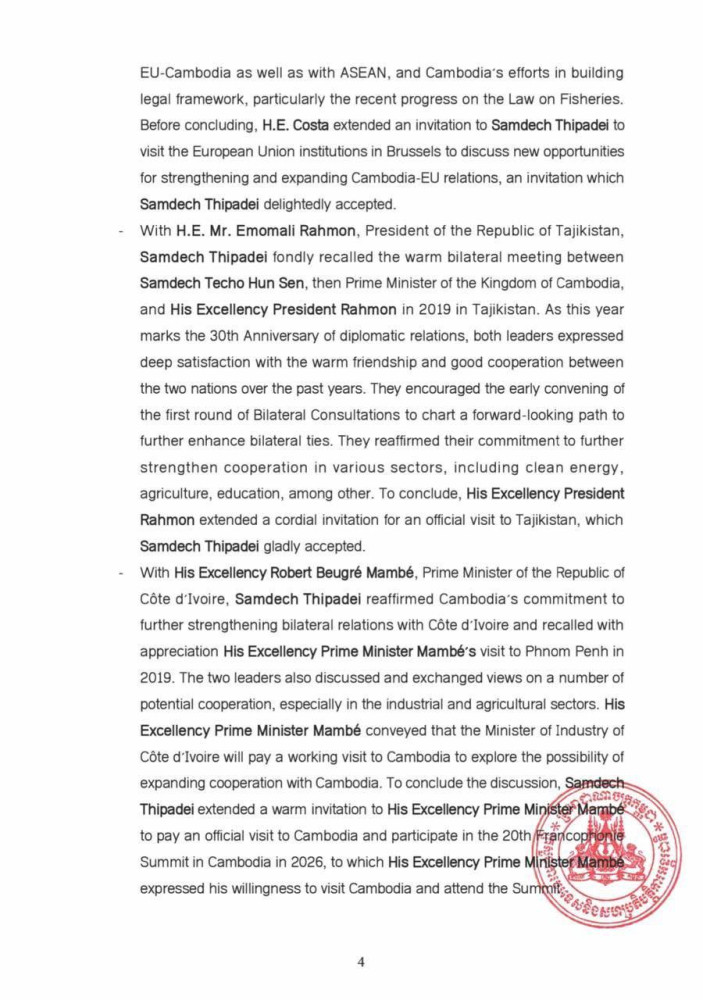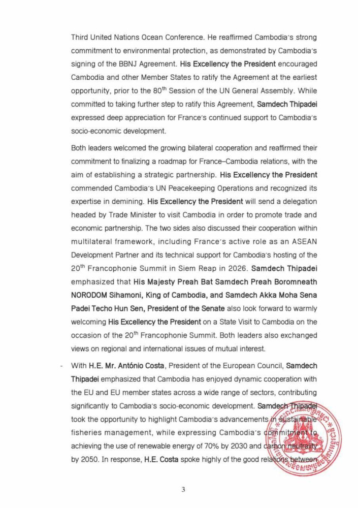 The following are the Outcomes of the Participation of Samdech Moha Borvor Thipadei Hun Manet, Prime Minister of the Kingdom of Cambodia in the Third United Nations Ocean Conference in Nice, France, released tonight: