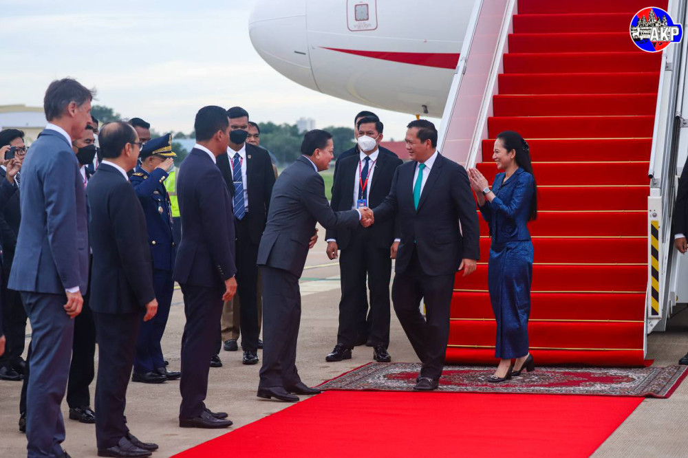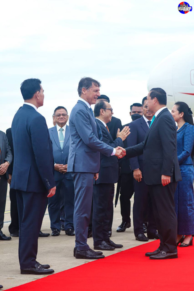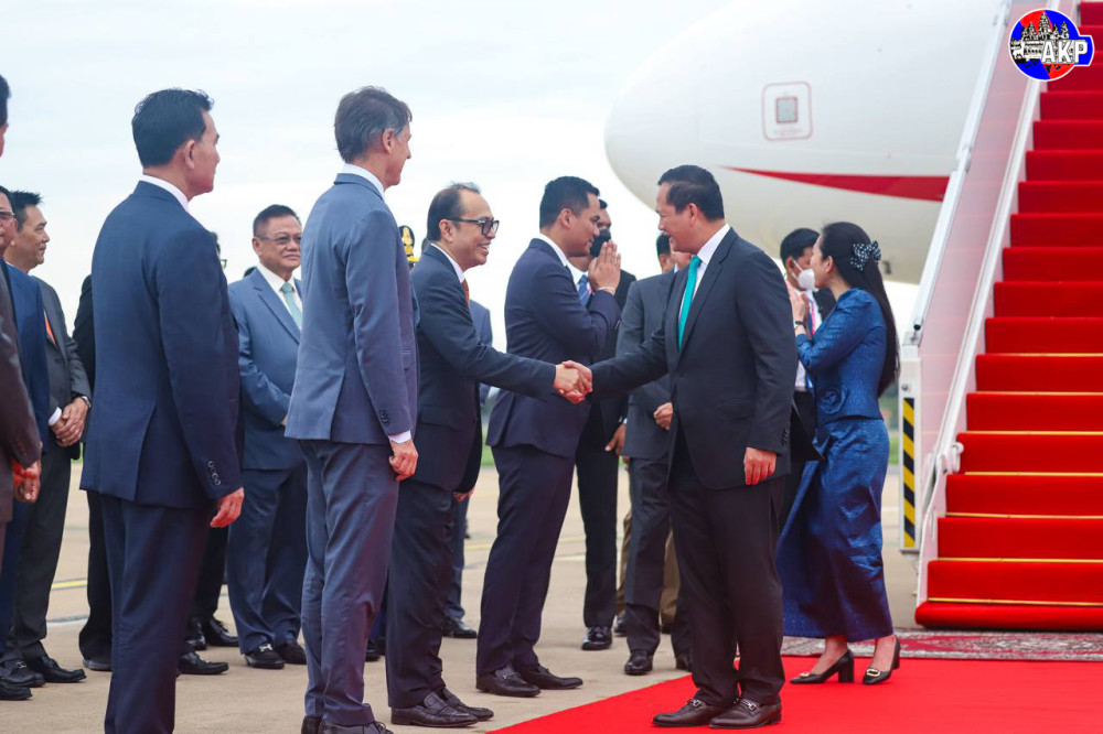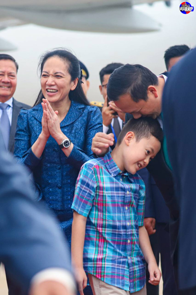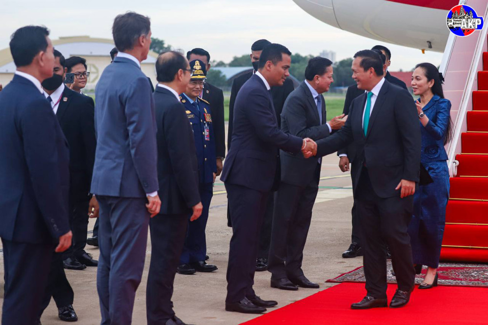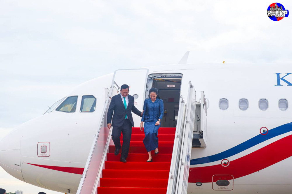 Prime Minister Samdech Moha Borvor Thipadei Hun Manet and First Lady Lok Chumteav Dr. Pich Chanmony disembark from a special aircraft upon their arrival at Phnom Penh International Airport this morning, after attending the Third United Nations Ocean Conference (UNOC3) in Nice, France from June 9 to 11.