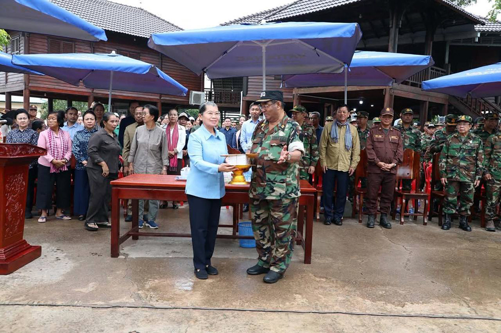 During the donation ceremony today, Samdech Men Sam An conveyed warm greetings and engaged with senior officers, deputy commanders, and soldiers. She was accompanied by H.E. Vong Sauth Second Vice President of the National Assembly and Vice President of the above-mentioned National Council, and his spouse.