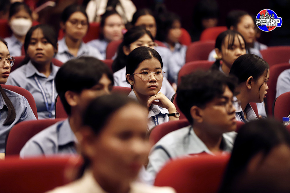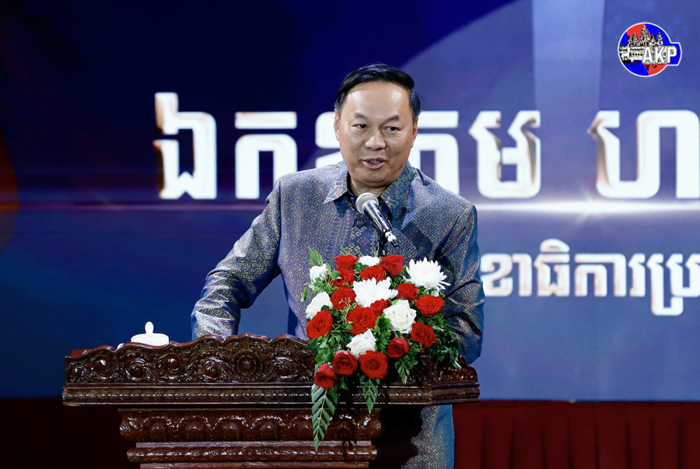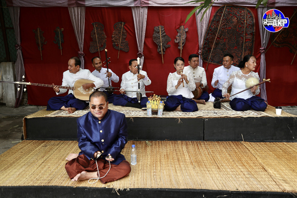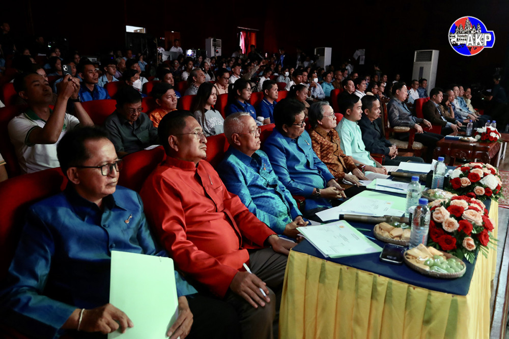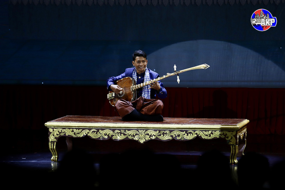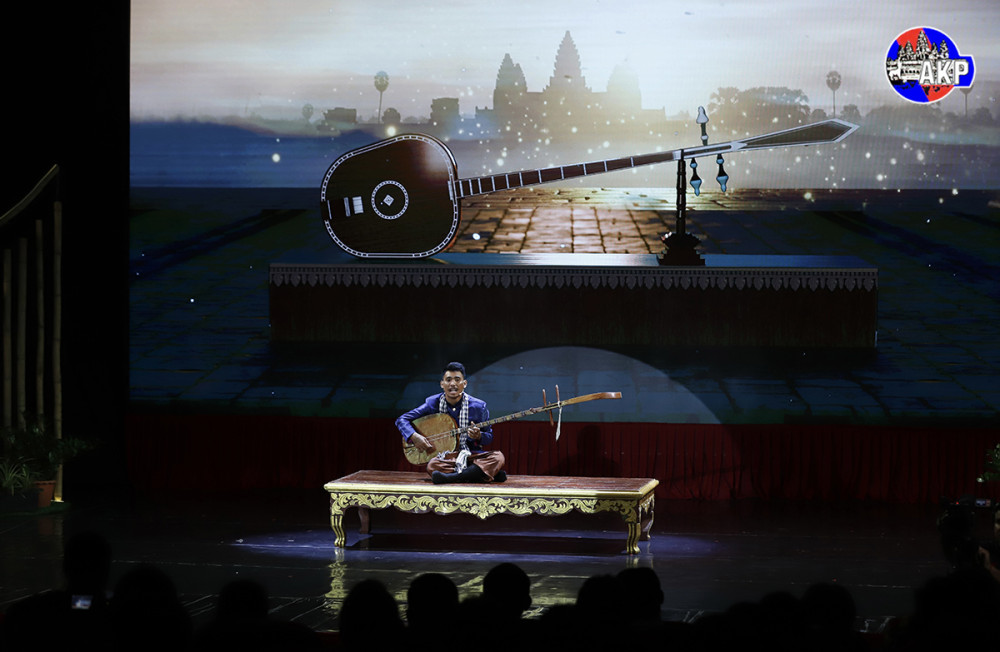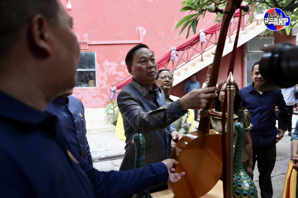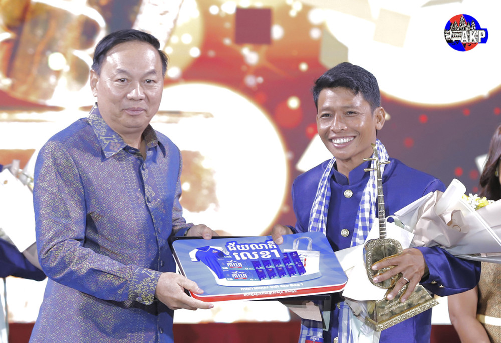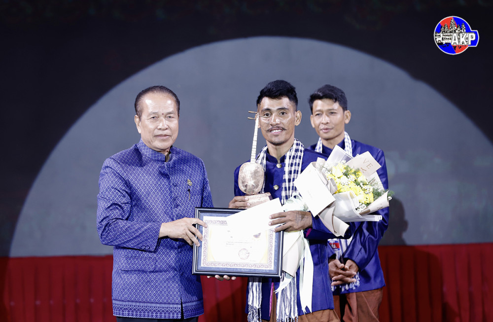 H.E. Hap Touch (L, Pic. 1), Permanent Secretary of State at the Ministry of Culture and Fine Arts, presents awards to the first winner of the National Chapei Dang Veng Festival 2025, held under the theme “Tumpaing Snong Russey” (bamboo shoots), at the Department of Visual Arts, Phnom Penh this afternoon.