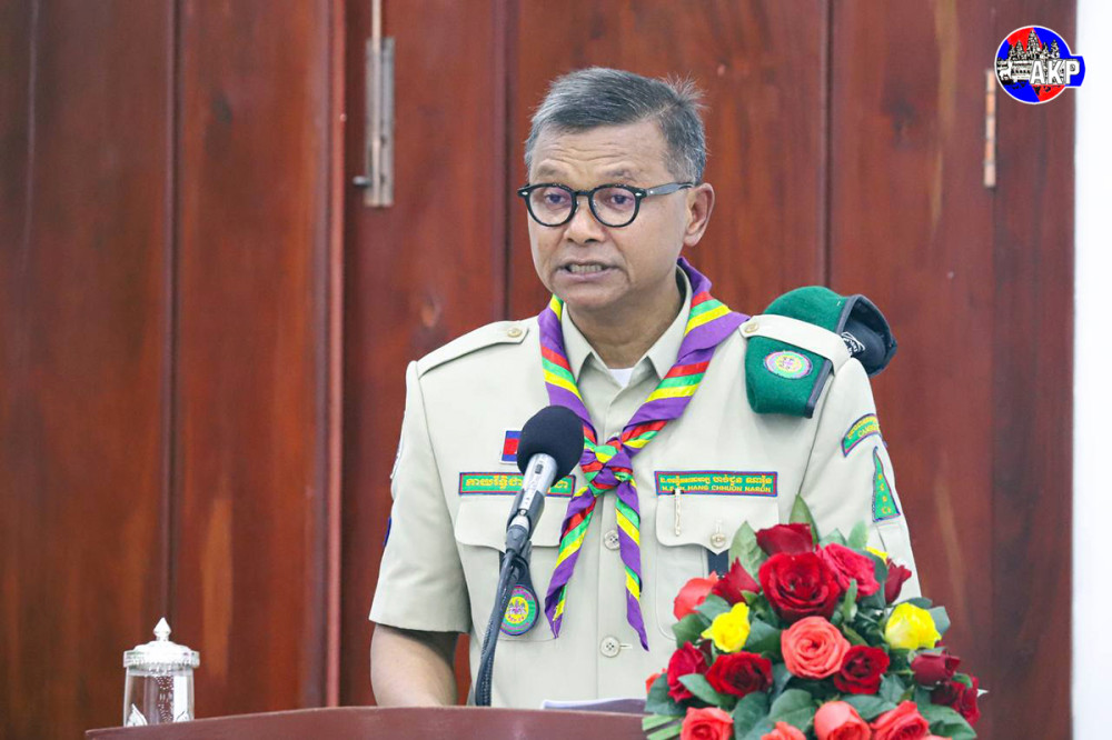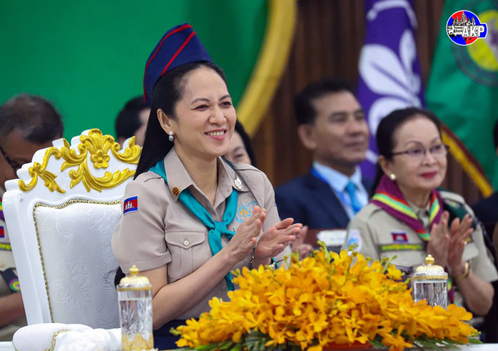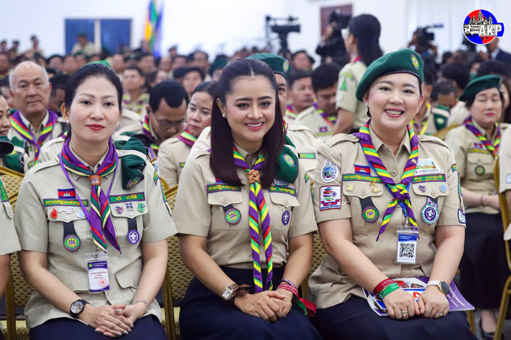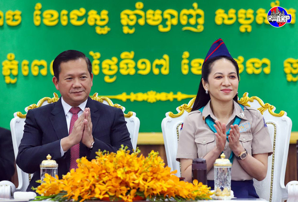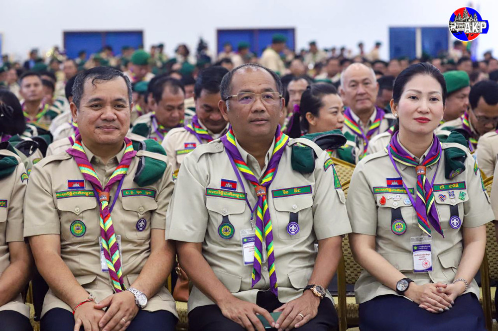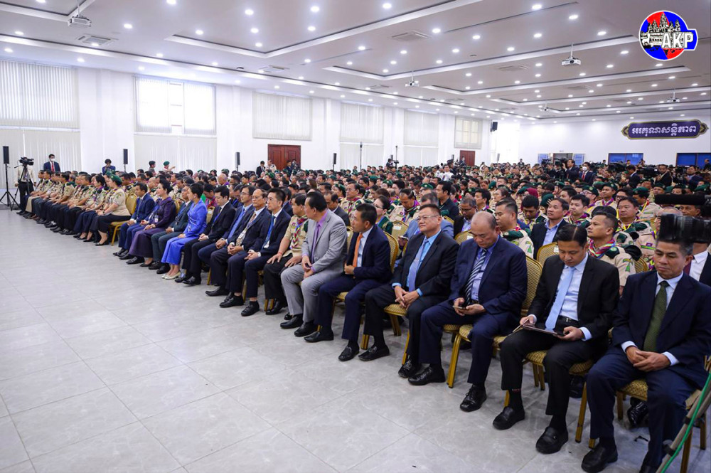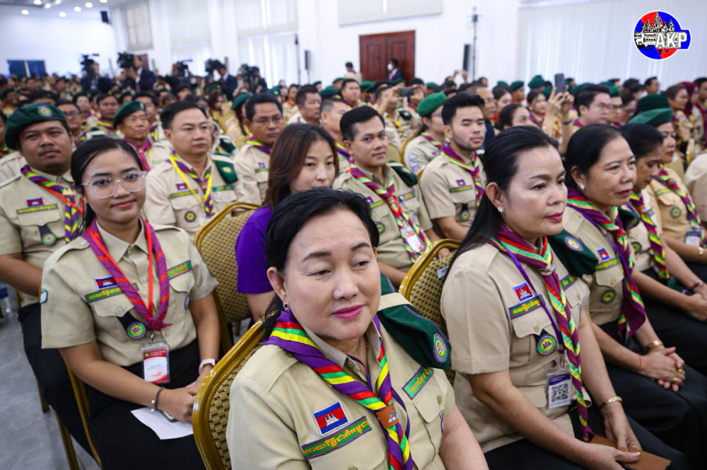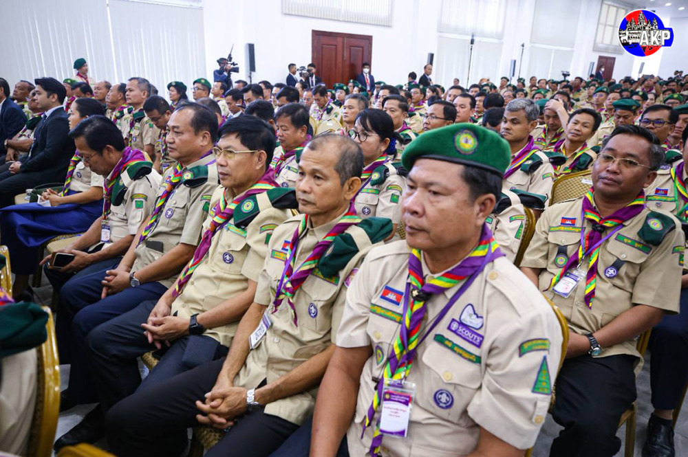 Prime Minister Samdech Moha Borvor Thipadei Hun Manet (Pic. 1) delivers his remarks while he and First Lady Lok Chumteav Dr. Pich Chanmony, Commissioner General of the Girl Guides Association of Cambodia, were presiding over the closing ceremony of the Extraordinary Congress of Cambodia Scouts, held this afternoon at the National Institute of Education in Phnom Penh.