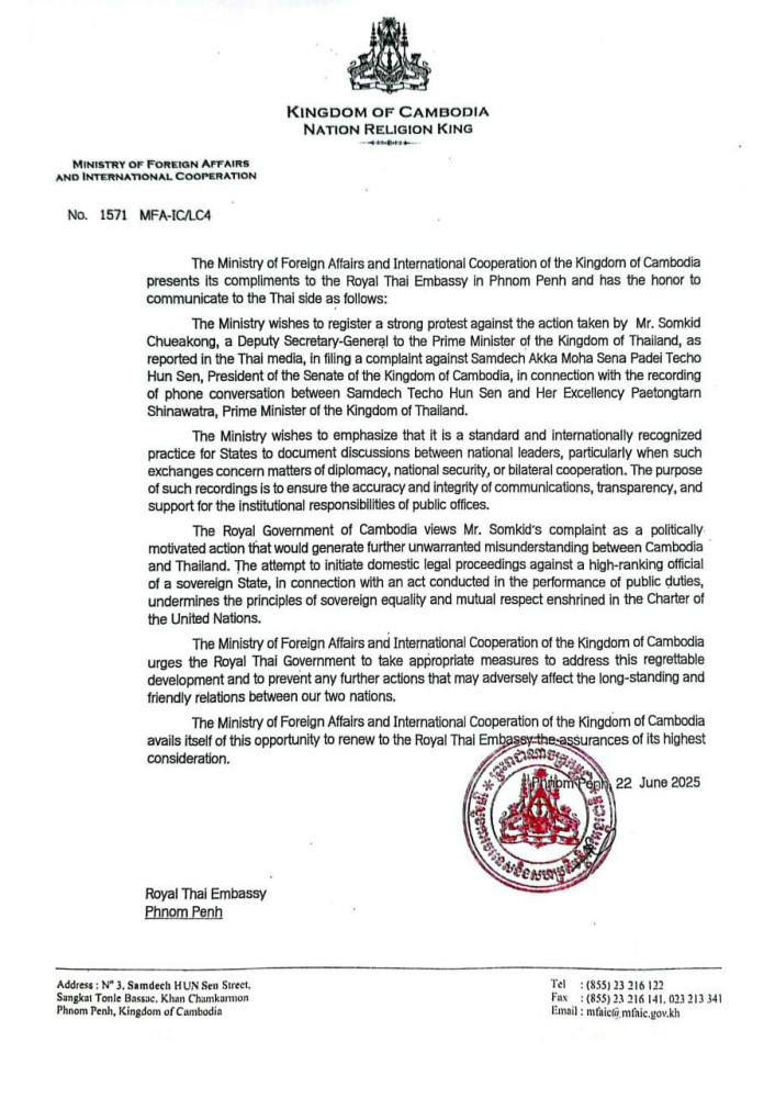 The Ministry of Foreign Affairs and International Cooperation of the Kingdom of Cambodia (MFAIC) has registered a strong protest against the action taken by Mr. Somkid Chueakong, a Deputy Secretary-General to the Prime Minister of the Kingdom of Thailand, as reported in the Thai media, in filing a complaint against Samdech Akka Moha Sena Padei Techo Hun Sen, President of the Senate of the Kingdom of Cambodia, in connection with the recording of phone conversation between Samdech Techo Hun Sen and H.E. Mrs. Paetongtarn Shinawatra, Prime Minister of the Kingdom of Thailand.