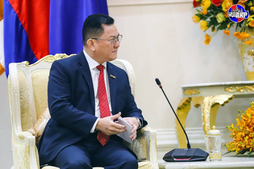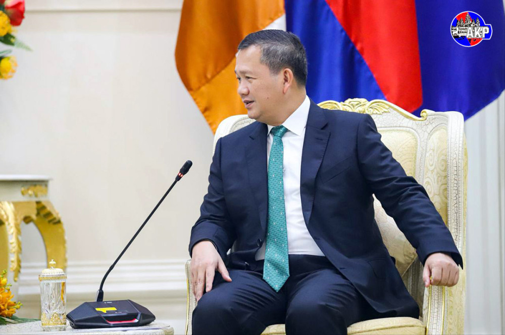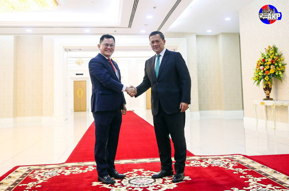 Samdech Moha Borvor Thipadei Hun Manet (R, Pic. 1), Prime Minister of the Kingdom of Cambodia, greets Dr. Dato' Sri Ricky Yaw, President of the Malaysia-Cambodia Business Association (MCBA), prior to their courtesy meeting at the Peace Palace here this afternoon.