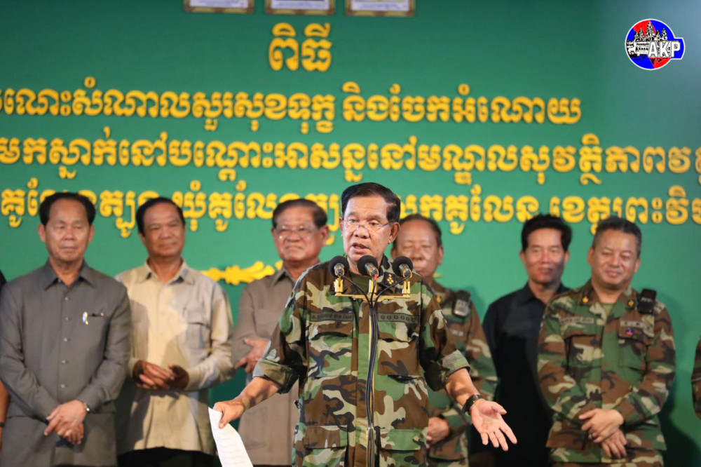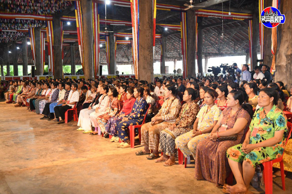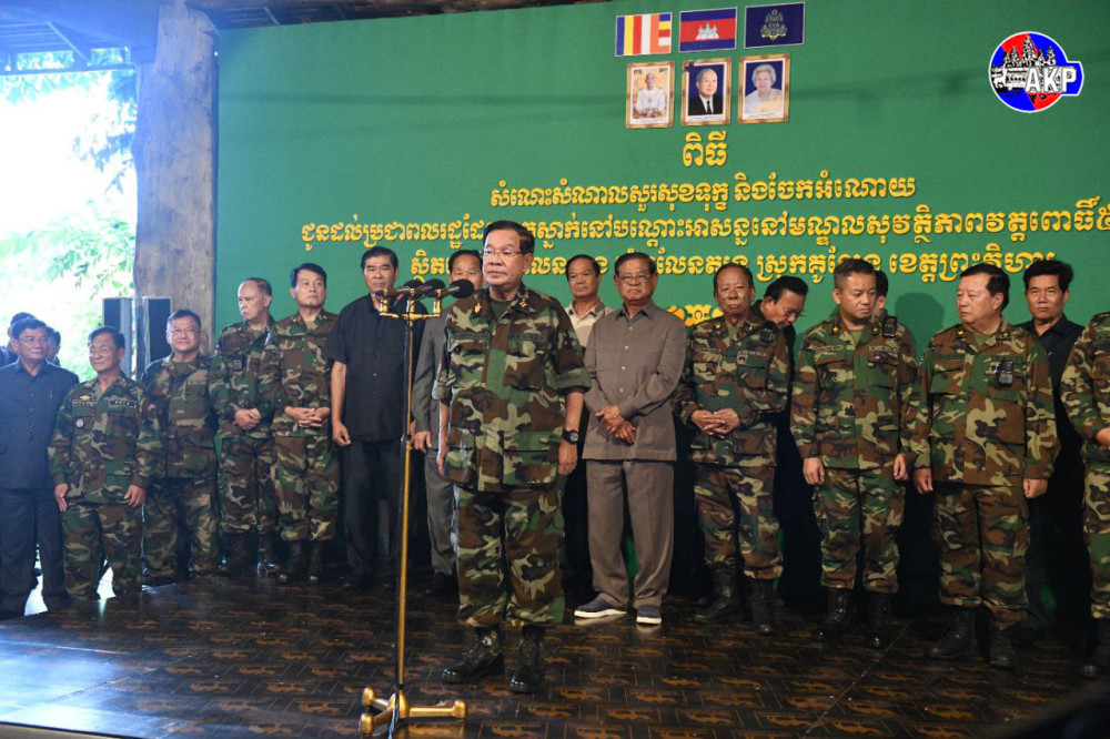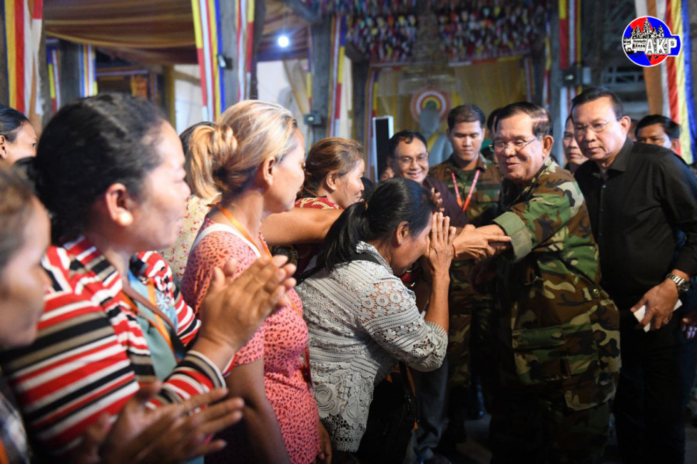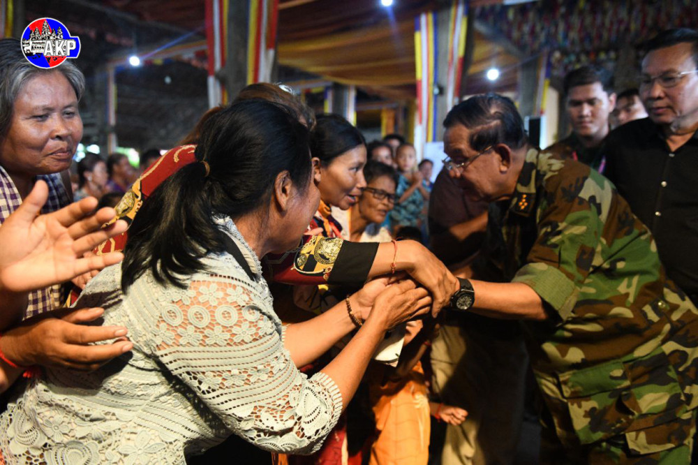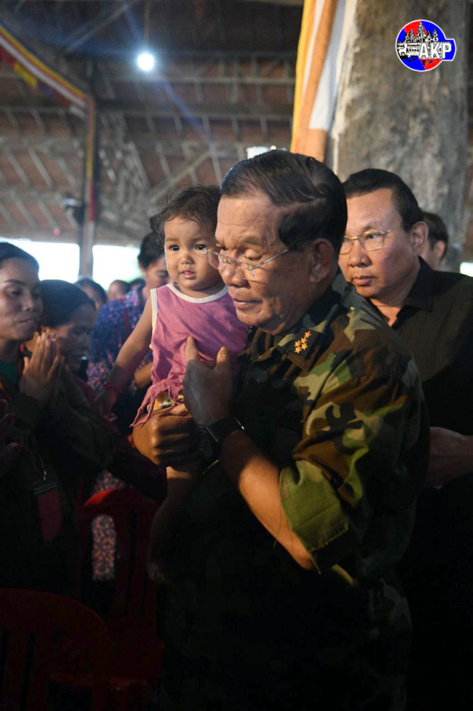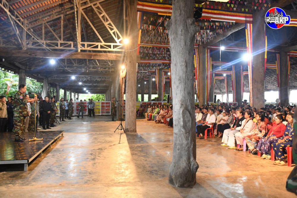 Samdech Akka Moha Sena Padei Techo Hun Sen (Pic. 1), Five-Star General and President of the Senate of the Kingdom of Cambodia, this evening pays a visit to express his well-wishes and distribute donations to over 1,500 families (nearly 5,000 people) who are temporarily shelter at Wat Po 5000 Safety Centre in Kulen Thbong village, Kulen Thbong commune, Kulen district, Preah Vihear province.