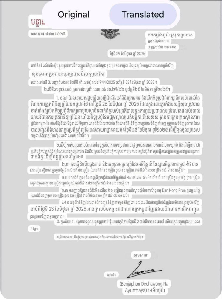 “1. Cambodia fully acknowledges the challenges faced by both Cambodian and Thai citizens as a result of the border closure. This is why we had refrained from implementing such a measure first, even after the tensions in the Mom Bei area in late May 2025. Our aim has never been to disrupt cross-border travel or trade between the two nations.