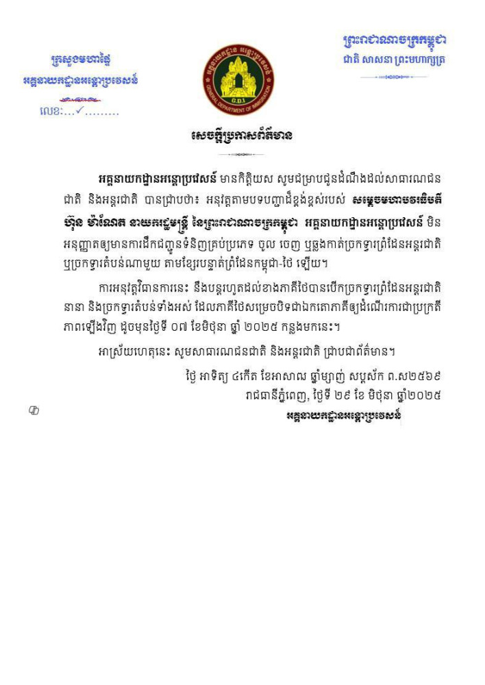 The General Department of Immigration made the announcement this afternoon, following the high-level directive of Samdech Moha Borvor Thipadei Hun Manet, Prime Minister of the Kingdom of Cambodia.