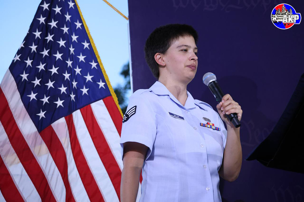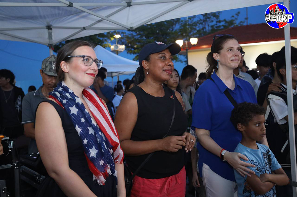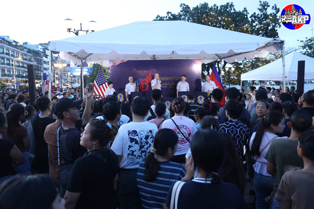 U.S. Air Force Pacific Brass Band performs in front of Ounalom pagoda on the Chaktomuk Walk Street in Phnom Penh during their visit to Cambodia from June 28 to July 4, as part of the activities to celebrate the 75th anniversary of the establishment of diplomatic relations between the two countries.