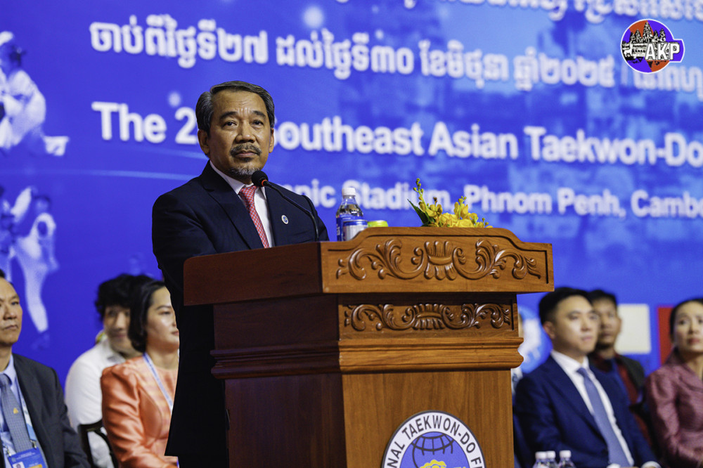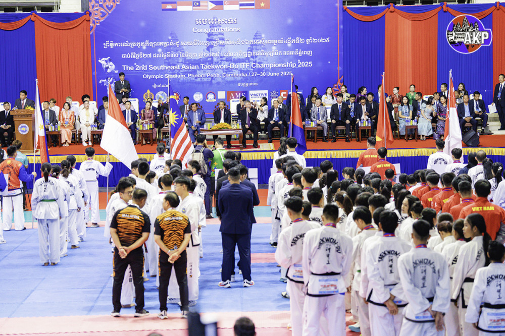 Senior Minister H.E. Keo Remy (Pic. 1), President of Cambodian Taekwon-Do ITF Federation, addresses the participants while he was presiding over the closing ceremony of the 2nd Southeast Asia Taekwon-Do ITF Championship 2025, held this afternoon at the National Olympic Stadium in Phnom Penh.