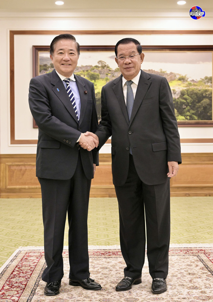 Samdech Akka Moha Sena Padei Techo Hun Sen (R, Pic. 1), President of the Senate of the Kingdom of Cambodia, greets visiting H.E. Nagashima Akihisa, Special Advisor to the Prime Minister and Member of the House of Representatives of Japan, prior to the courtesy meeting at the Senate Palace here this morning.