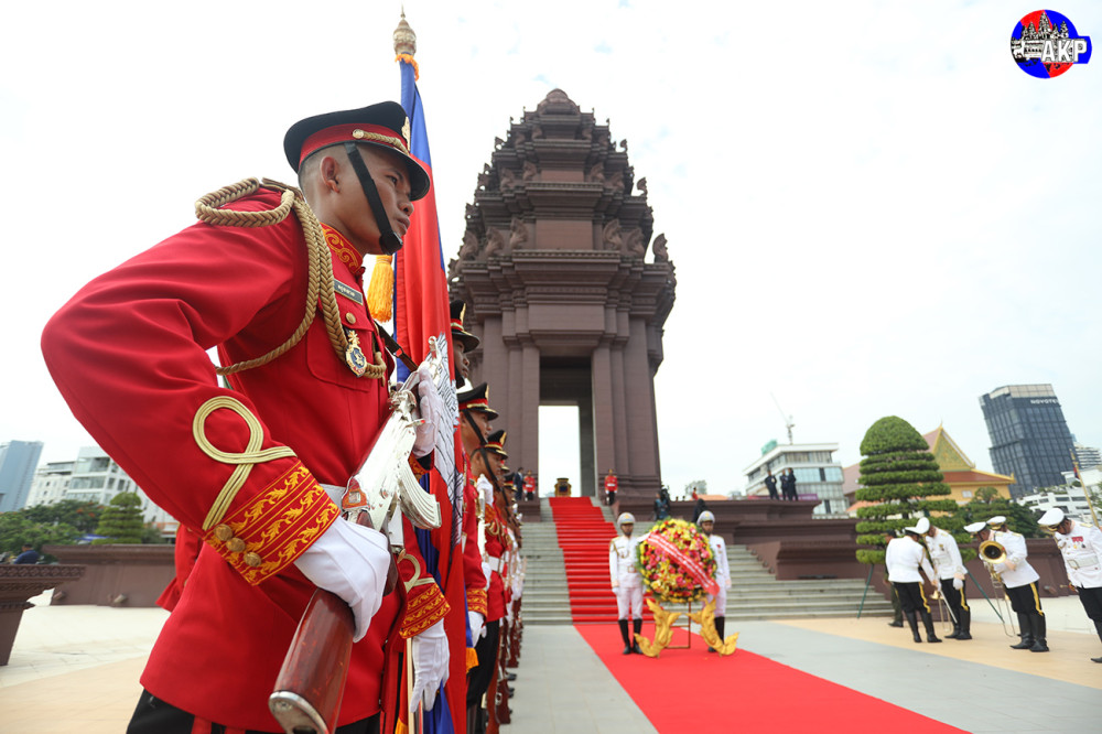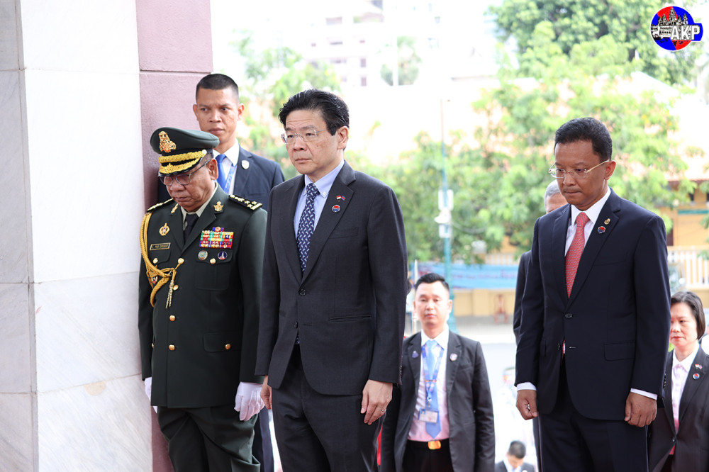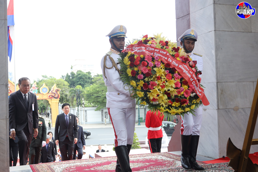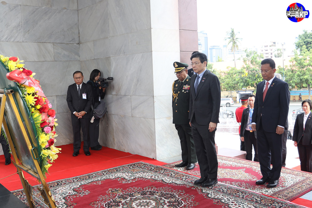 H.E. Lawrence Wong, Prime Minister and Minister for Finance of the Republic of Singapore, lays a wreath and pays respects at the Independence Monument in Phnom Penh this morning, as part of his day-long official visit to Cambodia.