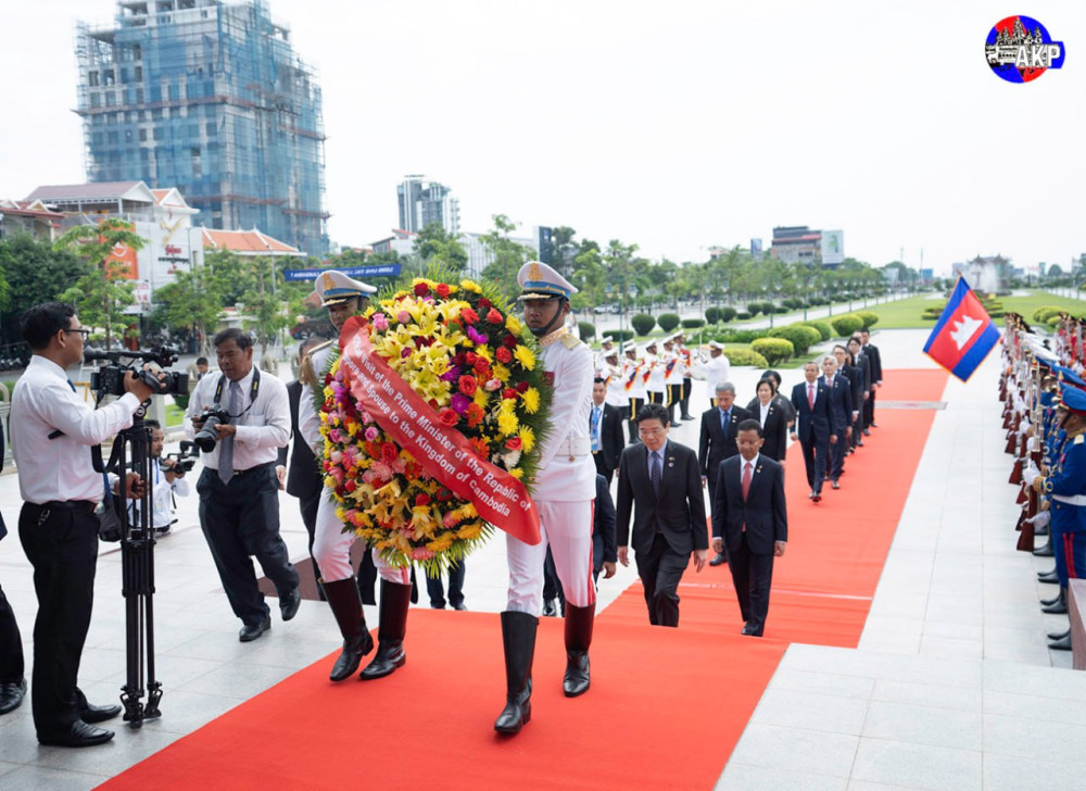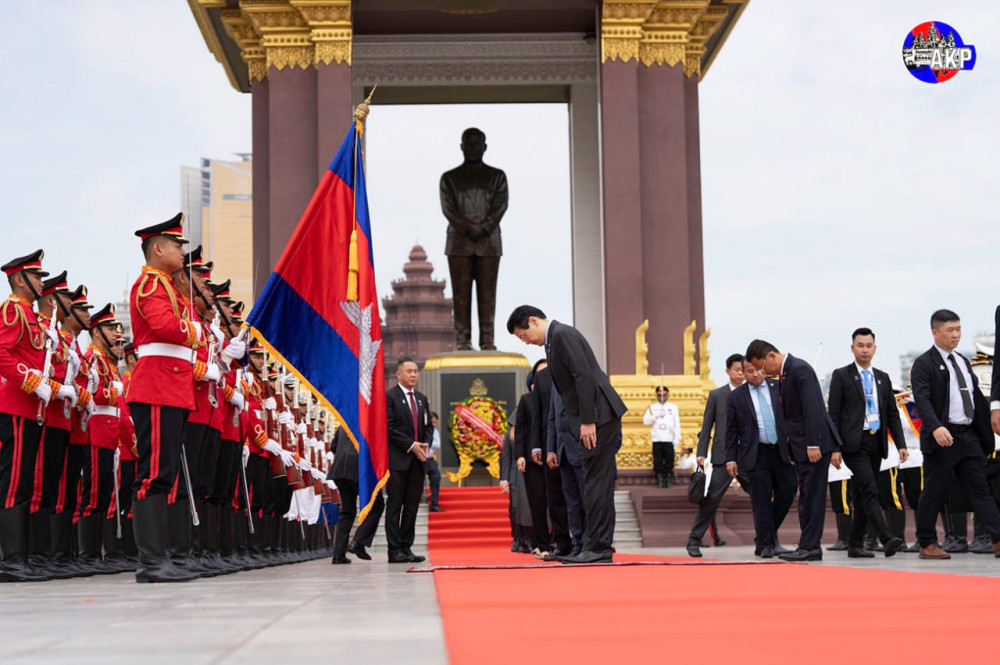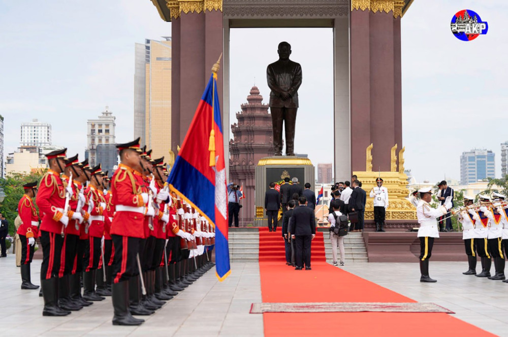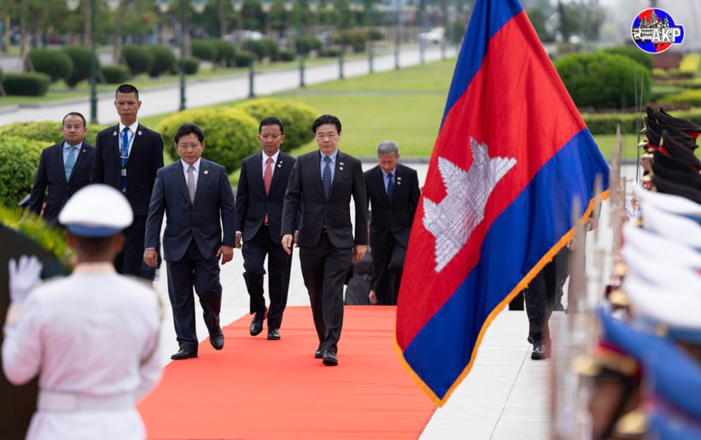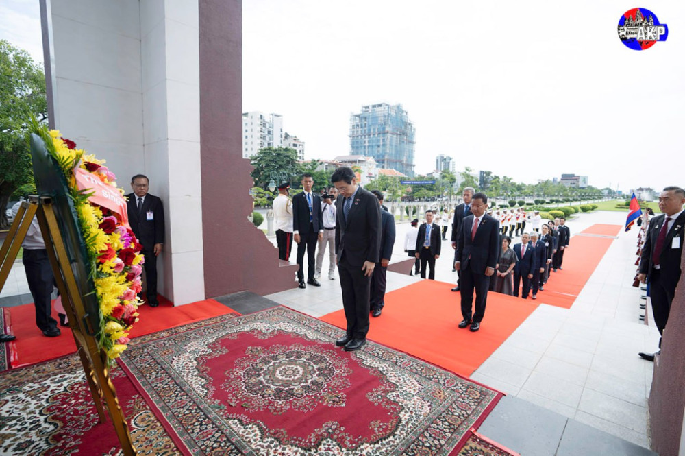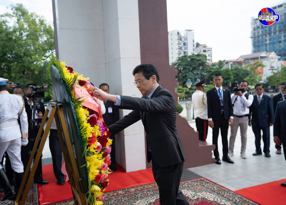 H.E. Lawrence Wong, Prime Minister and Minister for Finance of the Republic of Singapore, lays a wreath and pays tribute to His Majesty the Late King-Father Samdech Preah Norodom Sihanouk “Preah Borom Ratanak Kaudh” at the Royal Memorial Statue in Phnom Penh this morning, as part of his day-long official visit to Cambodia.