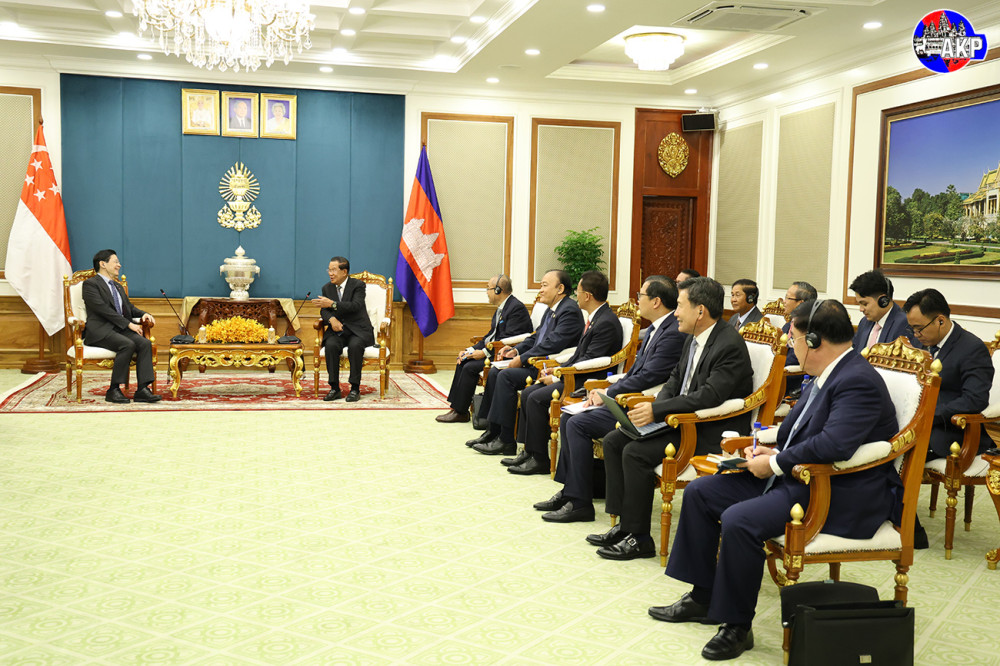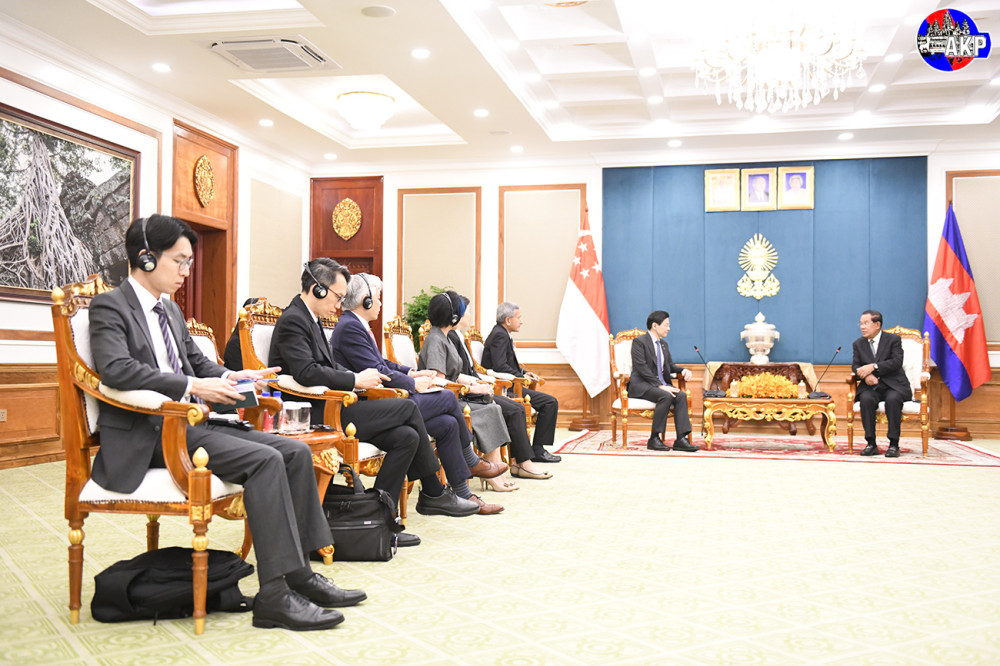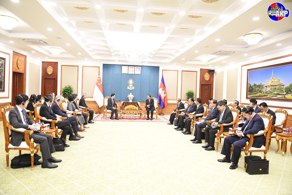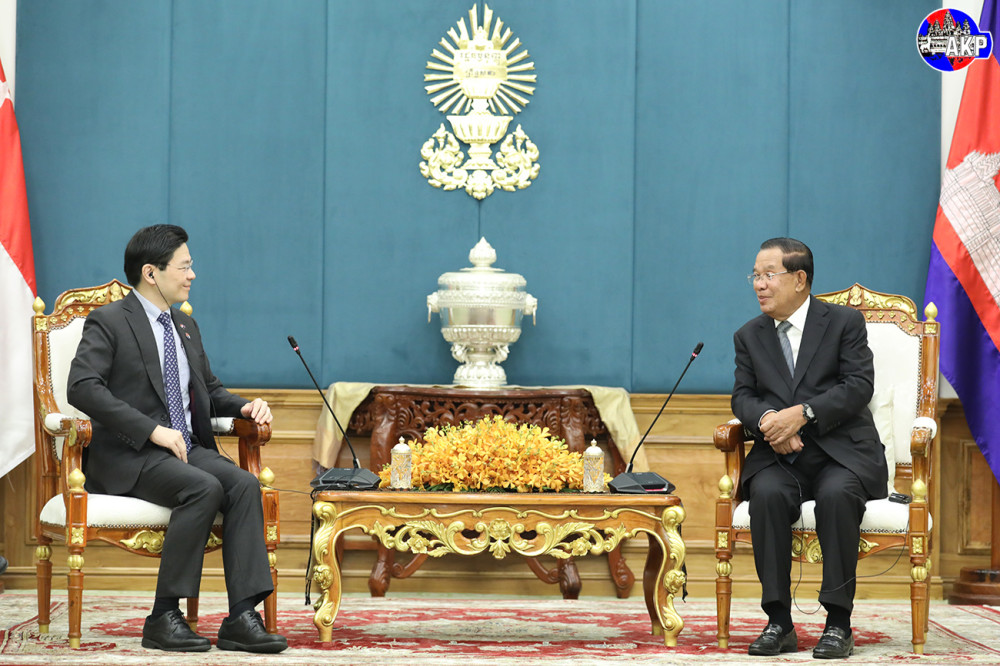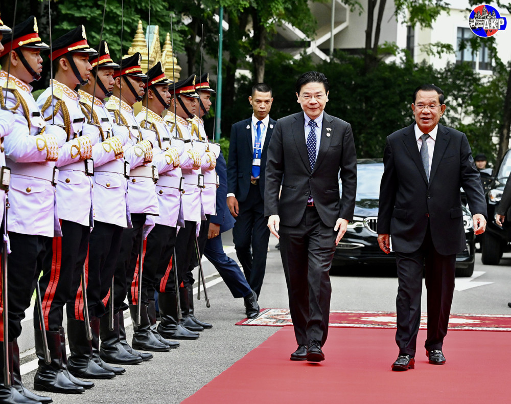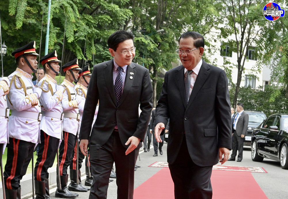 Cambodian Senate President, Samdech Akka Moha Sena Padei Techo Hun Sen (R, Pic. 1) shakes hands with H.E. Lawrence Wong, Prime Minister and Minister for Finance of the Republic of Singapore, prior to their courtesy meeting at the Senate Palace this morning.