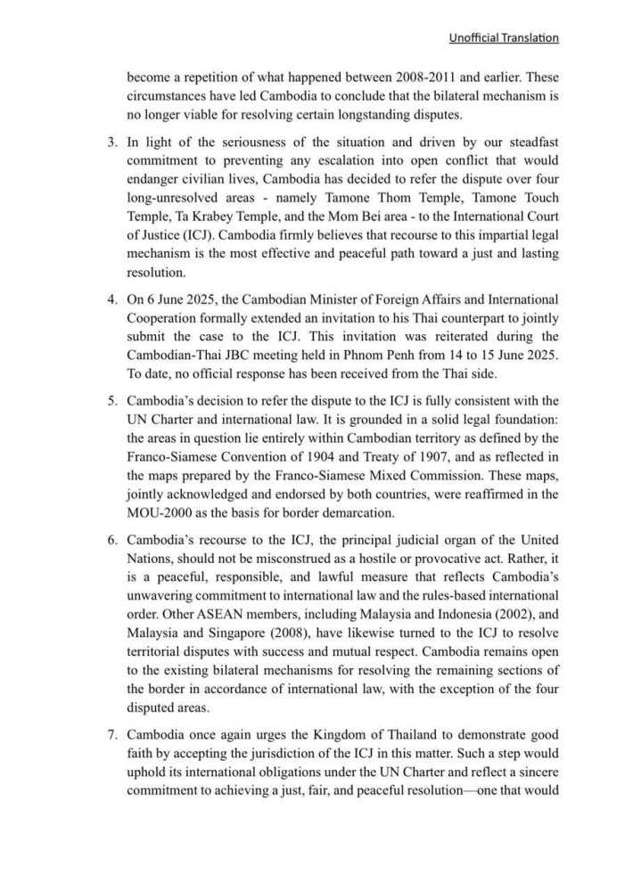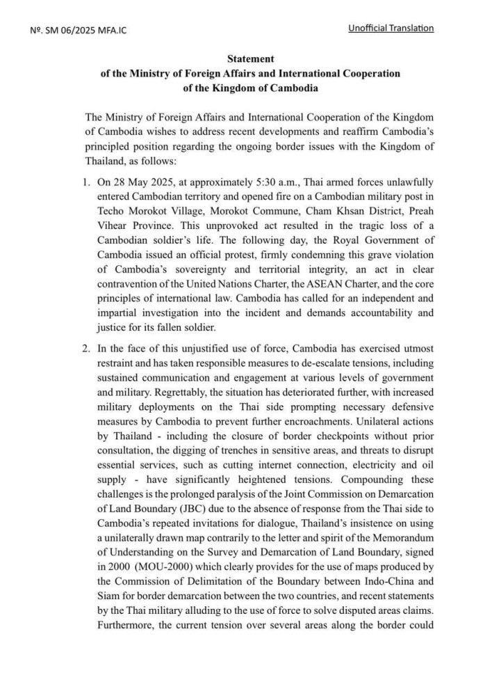 The Ministry of Foreign Affairs and International Cooperation of the Kingdom of Cambodia this morning issued a statement concerning the recent developments and reaffirmed Cambodia's principled position regarding the ongoing border issues with the Kingdom of Thailand.