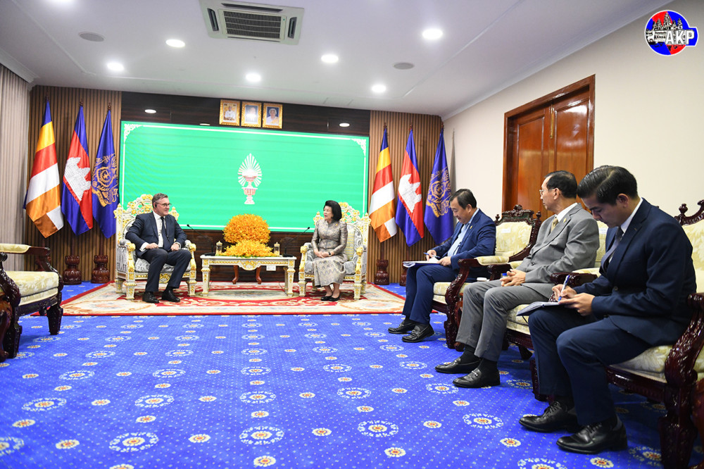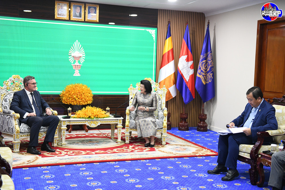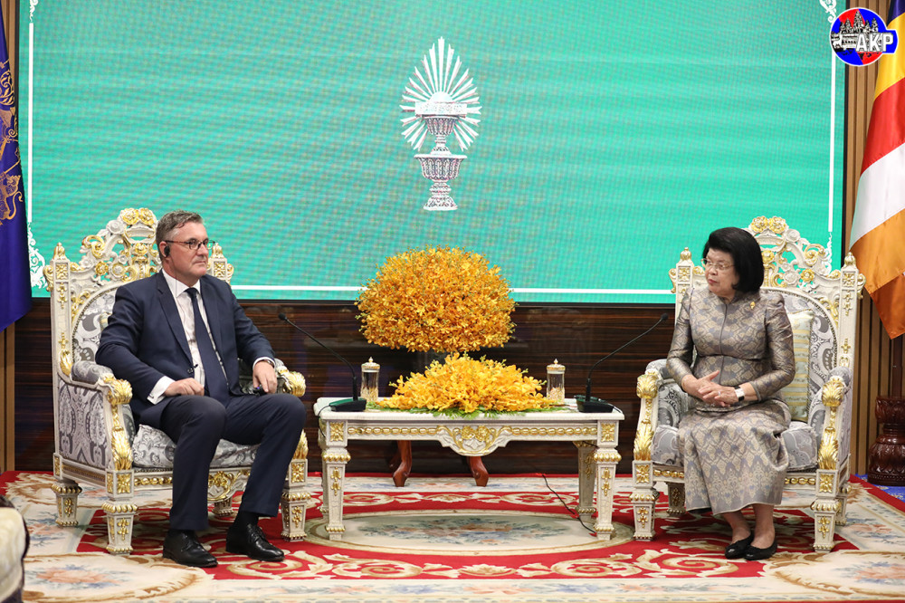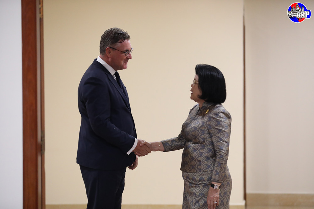 Samdech Maha Rathsapheathika Thipadei Khuon Sudary (R, Pic. 1), President of the National Assembly of the Kingdom of Cambodia, greets H.E. Martin Vávra, outgoing Ambassador of the Czech Republic to the Kingdom of Cambodia, prior to their courtesy farewell meeting at the National Assembly Palace in Phnom Penh this morning.