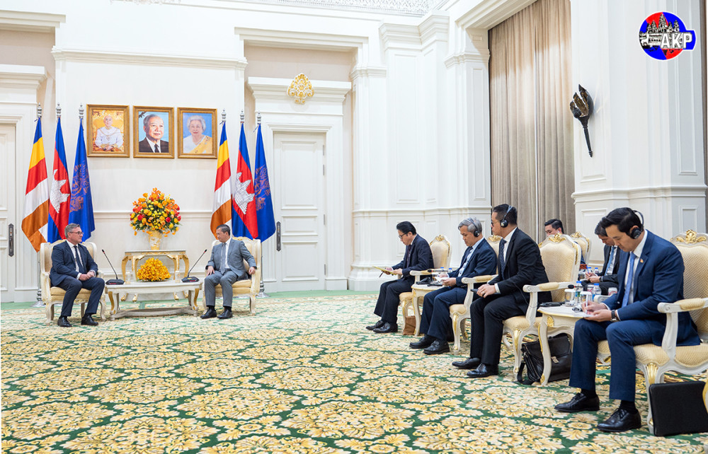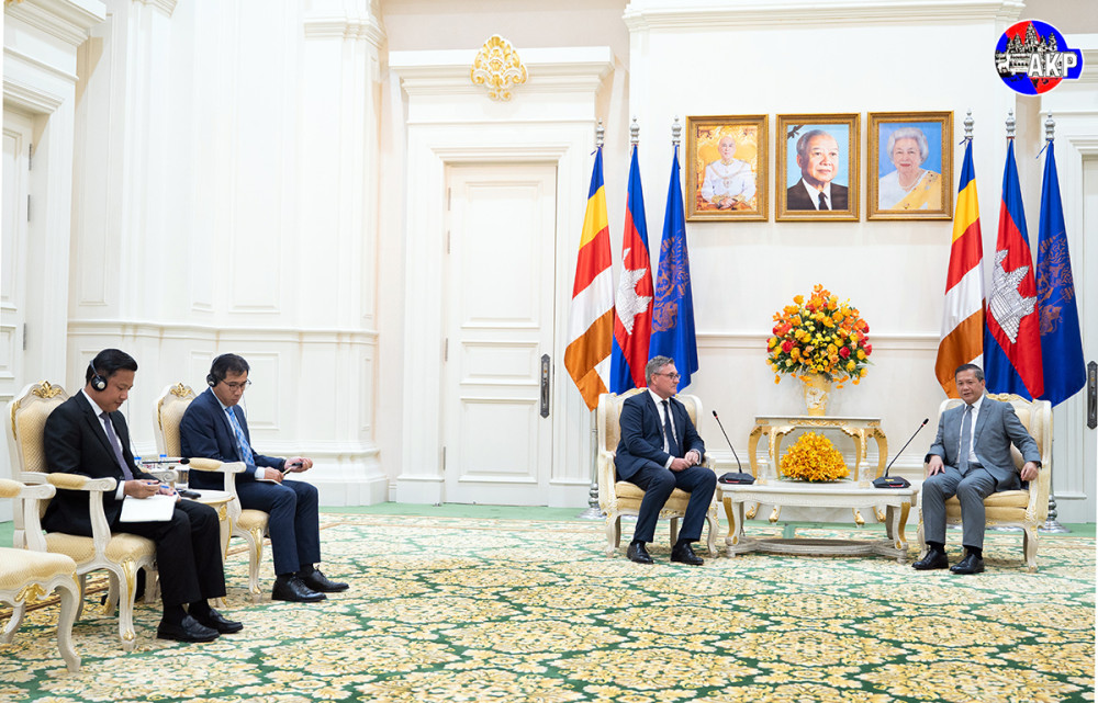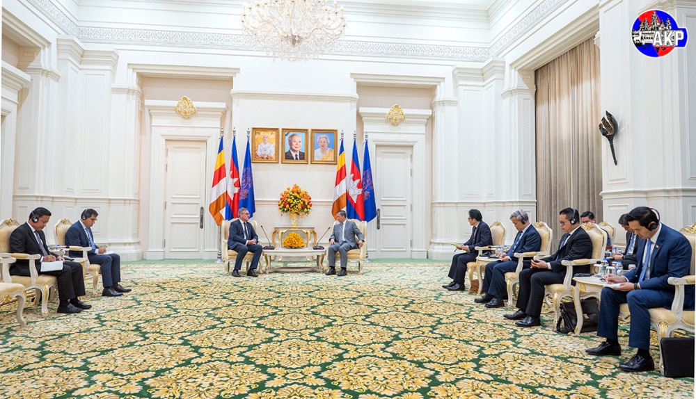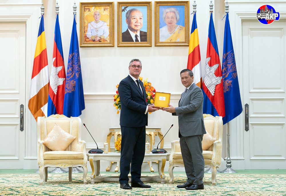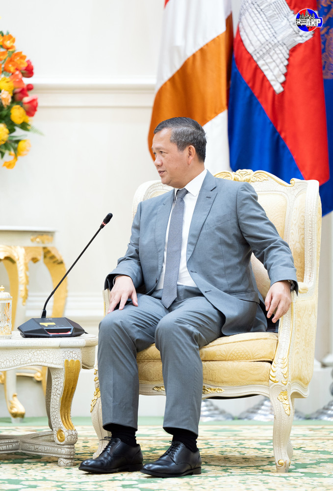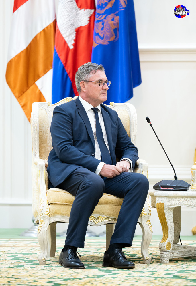 Samdech Moha Borvor Thipadei Hun Manet (R, Pic. 1), Prime Minister of Cambodia, shakes hands with H.E. Martin Vávra, outgoing Ambassador of the Czech Republic to the Kingdom of Cambodia, prior to the courtesy farewell meeting at the Peace Palace in Phnom Penh this afternoon.