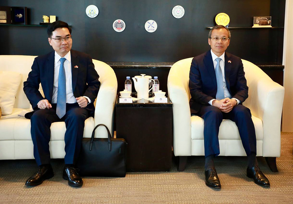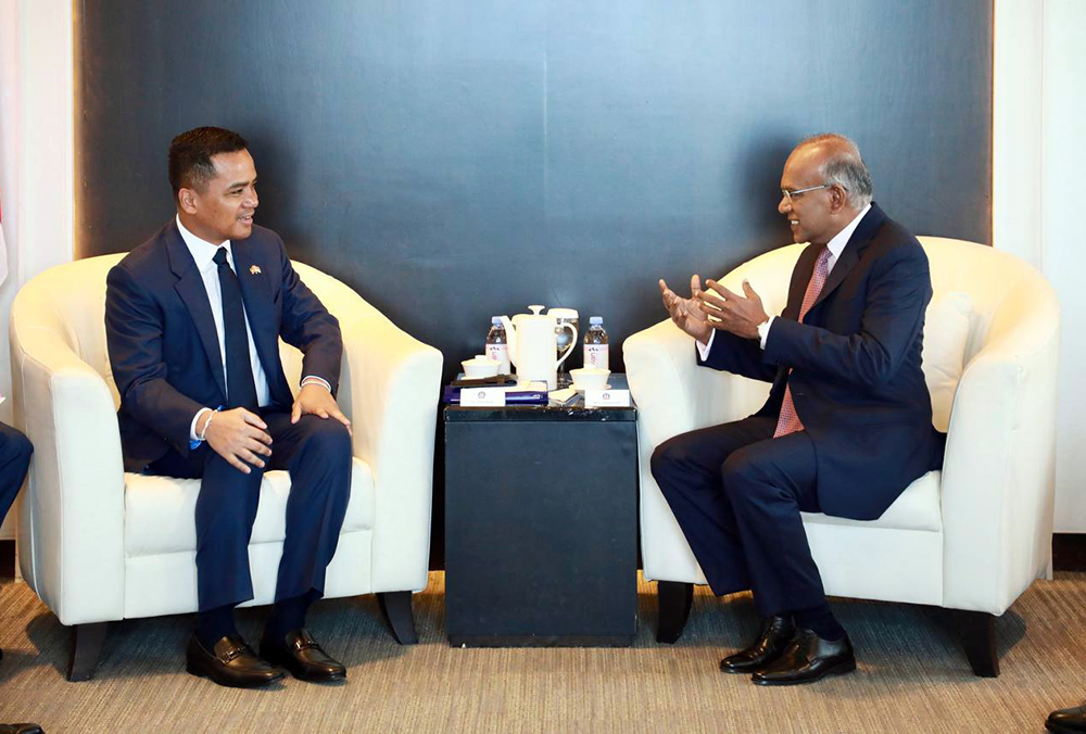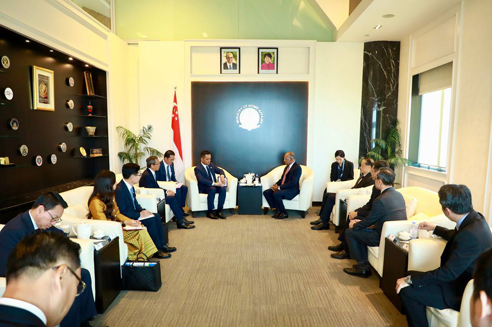 H.E. Aphi Santepundit Sar Sokha (R, Pic. 1), Deputy Prime Minister, Minister of Interior of the Kingdom of Cambodia, holds a discussion with H.E. K. Shanmugam, Singapore's Coordinating Minister for National Security and Minister for Home Affairs, at the Ministry of Home Affairs in Singapore on July 8, as part of his three-day (July 7-9) working visit there.
