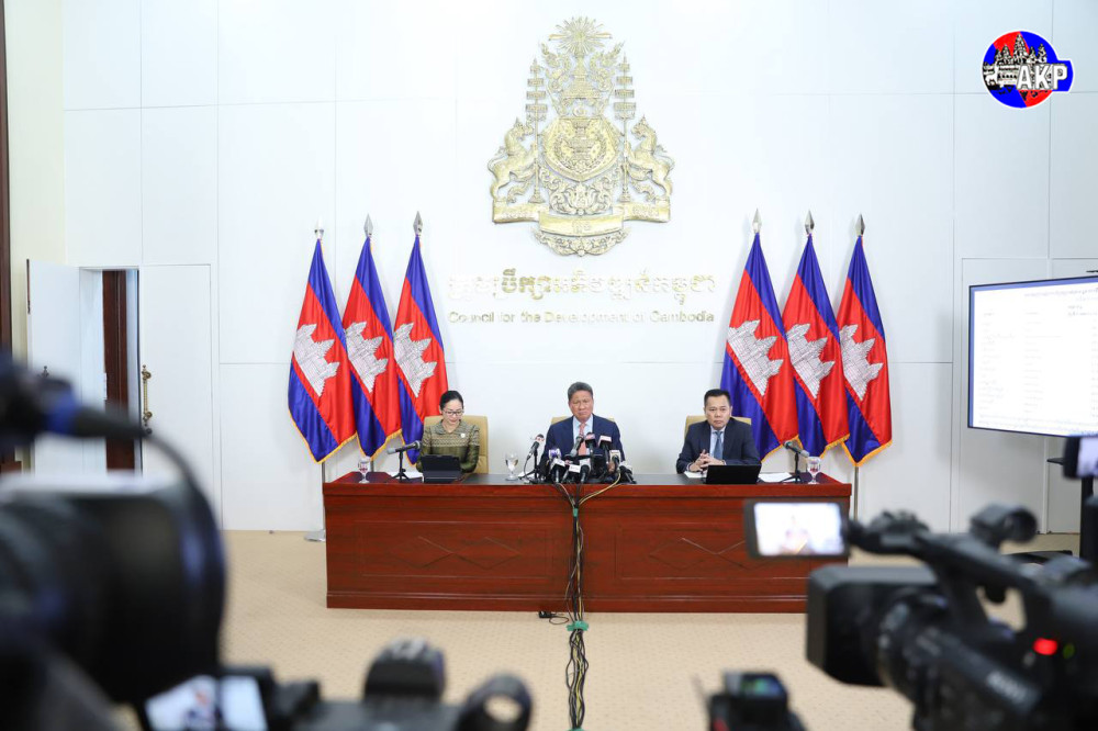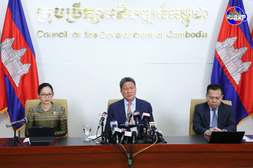 H.E. Sun Chanthol (C, Pic. 1), Deputy Prime Minister and First Vice President of the Council for the Development of Cambodia (CDC), gives a press conference on the outcomes of reciprocal tariff negotiations with the U.S., at the CDC headquarters in Phnom Penh this afternoon.