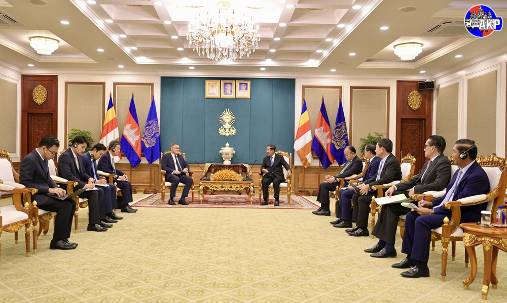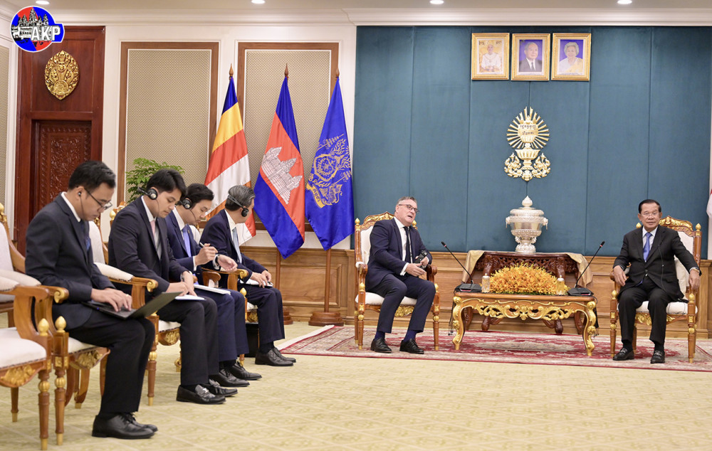 Samdech Akka Moha Sena Padei Techo Hun Sen (R, Pic. 1), President of the Senate of the Kingdom of Cambodia, shakes hands with H.E. Martin Vávra, Ambassador of the Czech Republic to Cambodia, prior to their farewell meeting at the Senate Palace in Phnom Penh this morning.