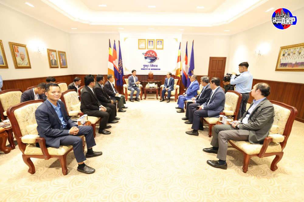 Minister of Information H.E. Neth Pheaktra (R, Pic. 1) meets with H.E. Khov Chhay, President of the Kun Khmer Federation, and his colleagues, at the ministry this afternoon.