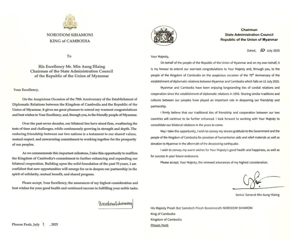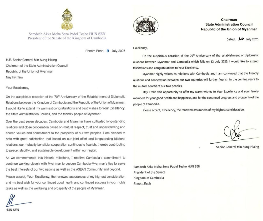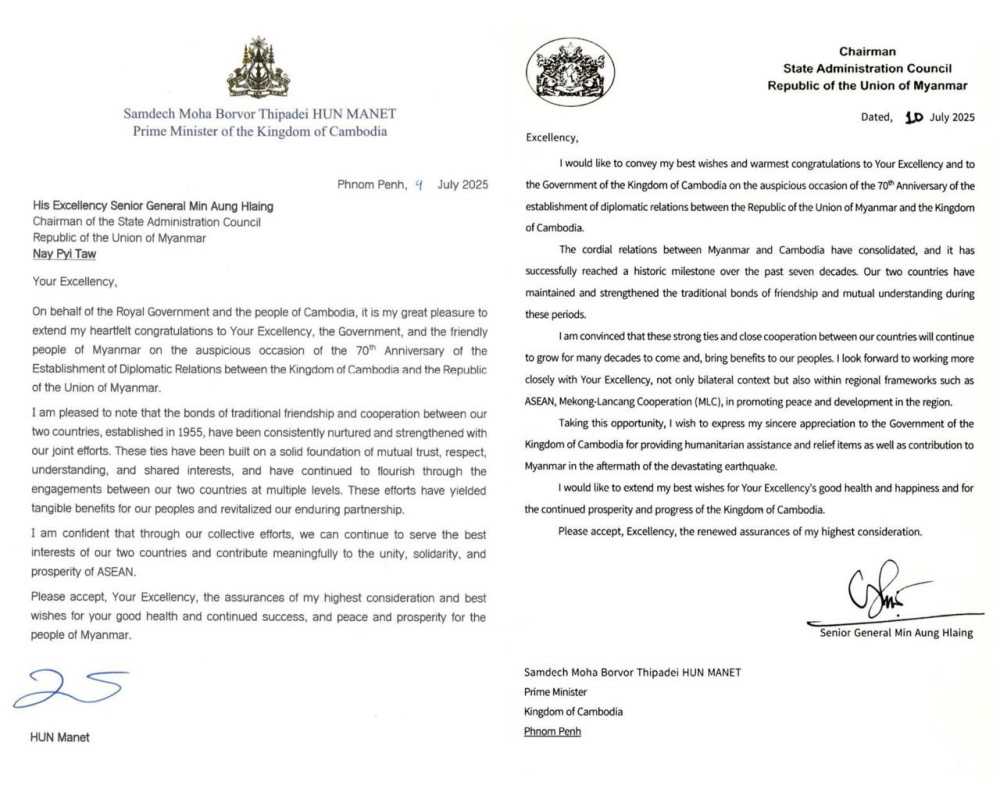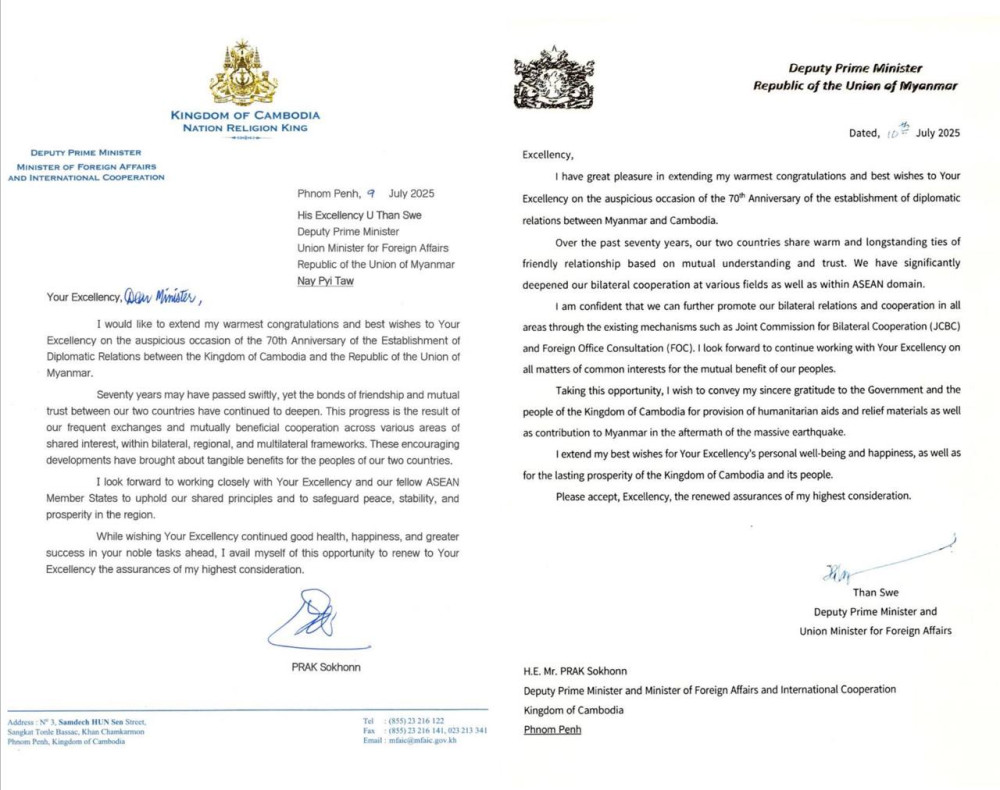 Top leaders of Cambodia and Myanmar have exchanged congratulatory messages on the occasion of the 70th anniversary of the establishment of diplomatic relations between the two countries.