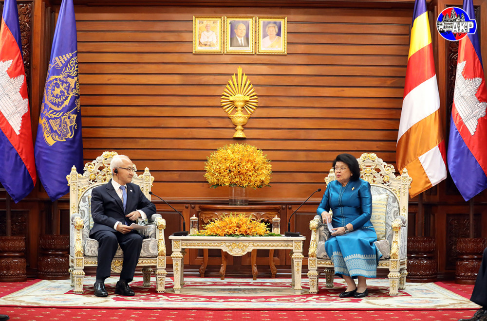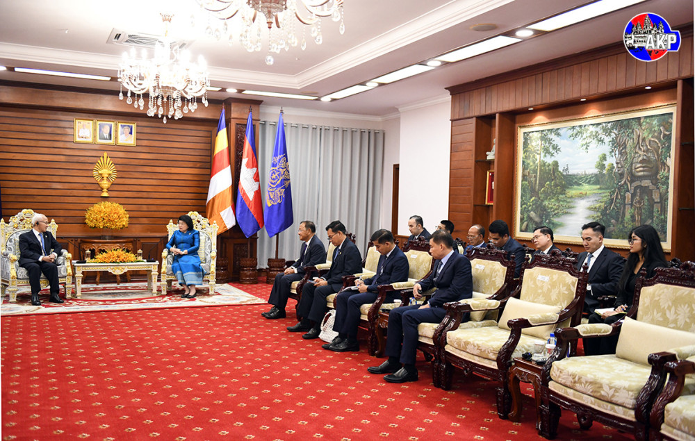 Samdech Maha Rathsapheathika Thipadei Khuon Sudary (R, Pic. 1), President of the National Assembly (NA) of Cambodia, holds talks with visiting H.E. Wang Zhimin, Vice Chairman of the Ethnic Affairs Committee of the National People’s Congress of China, at the NA Palace in Phnom Penh this afternoon.