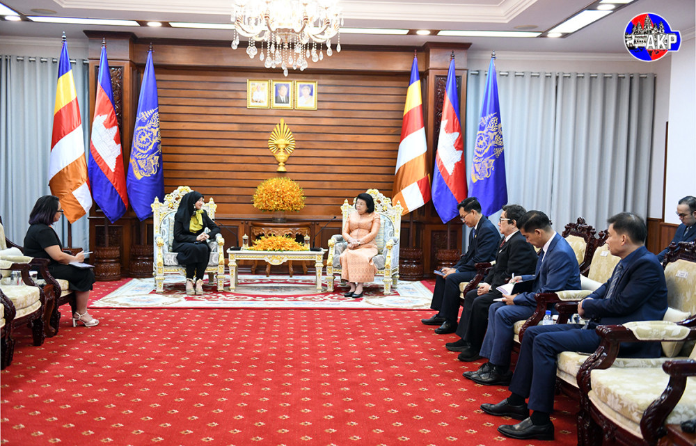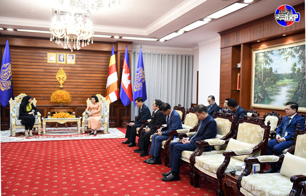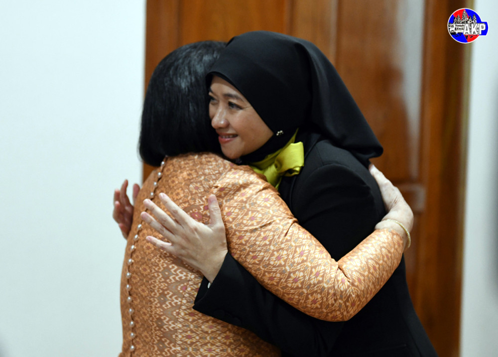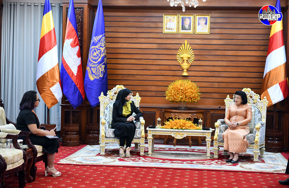 Samdech Maha Rathsapheathika Thipadei Khuon Sudary (L, Pic. 1), President of the National Assembly of the Kingdom of Cambodia, warmly greets visiting H.E. Ms. Siti Rozaimeriyanty Dato Haji Abdul Rahman, Secretary-General of the ASEAN Inter-Parliamentary Assembly (AIPA), prior to a courtesy call and discussion at the National Assembly Palace in Phnom Penh this afternoon.