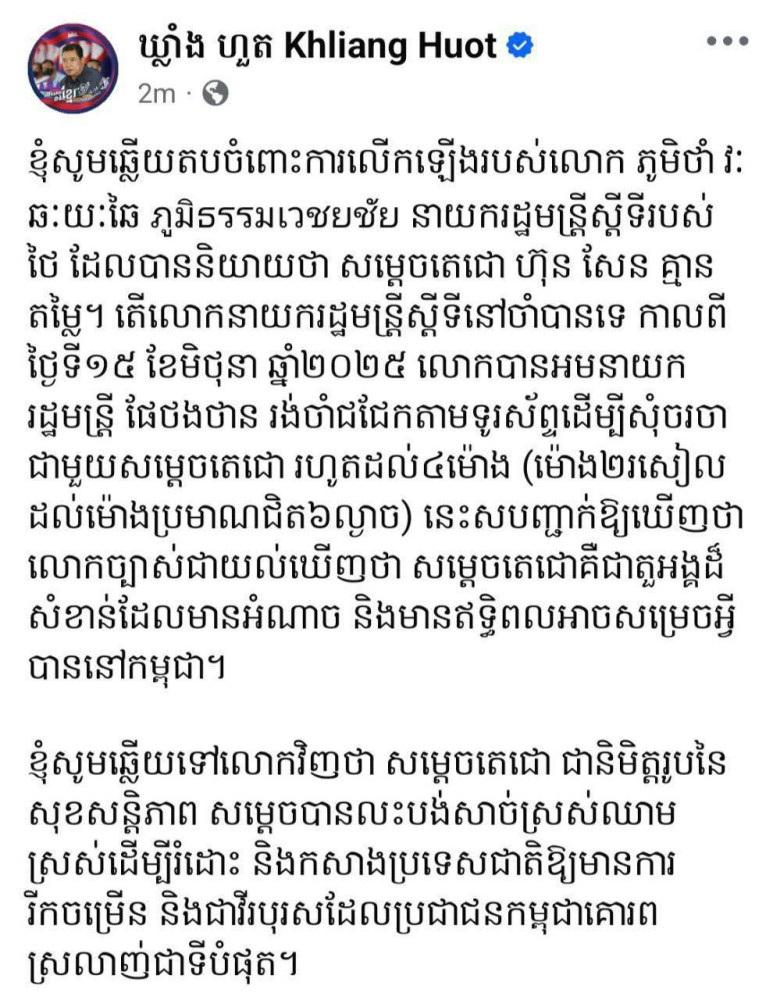 “Earlier, Khliang Huot responded to the Acting Prime Minister and former Minister of Defence of Thailand, who had attacked me.
