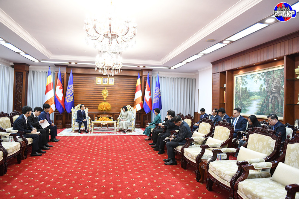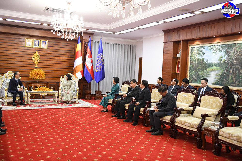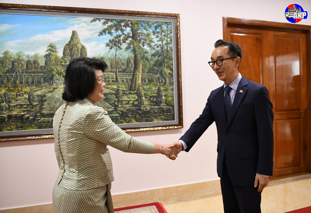 Samdech Maha Rathsapheathika Thipadei Khuon Sudary (L, Pic. 1), President of the National Assembly of the Kingdom of Cambodia, greets H.E. Park Jung-Wook, outgoing Ambassador of the Republic of Korea to Cambodia, prior to a courtesy and farewell call at the National Assembly Palace in Phnom Penh this morning.