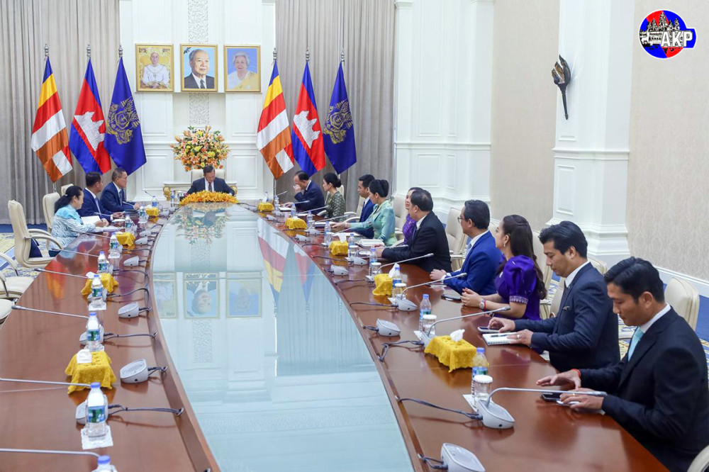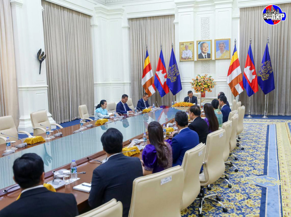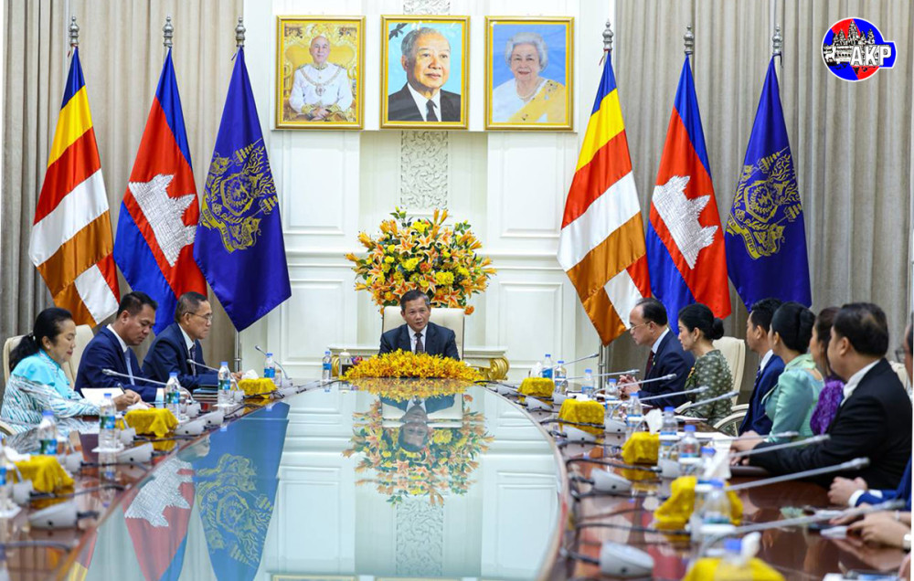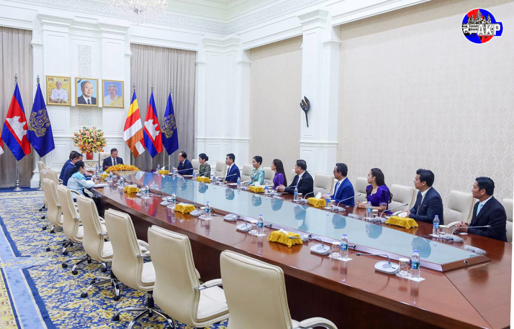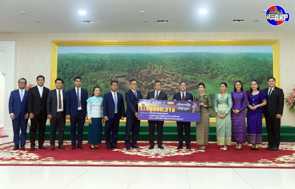 Prime Minister Samdech Moha Borvor Thipadei Hun Manet (7th R, Pic. 1) receives a fund of US$500,216 raised by the CTN Foundation to support troops stationed along the nation’s borders from Neak Oknha Kith Meng (6th R, Pic. 1), Chairman and CEO of Royal Group who owns CTN Television, and his spouse Mao Chamnan, at the Peace Palace in Phnom Penh this afternoon.