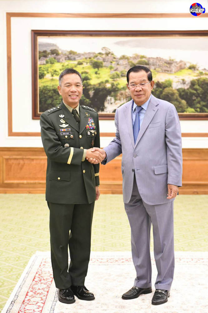 Samdech Akka Moha Sena Padei Techo Hun Sen (R, Pic . 1), President of the Senate of the Kingdom of Cambodia, greets visiting H.E. Roy M. Galido, Commanding General of the Philippine Army, prior to a courtesy meeting at the Senate Palace in Phnom Penh this morning.