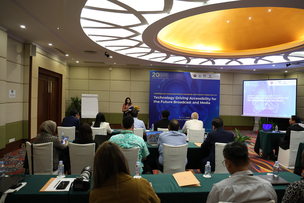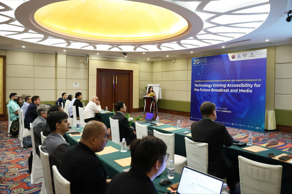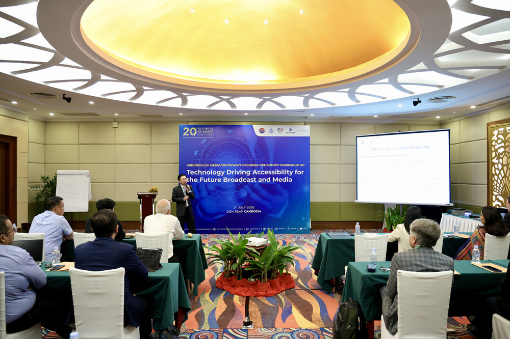 H.E. Sambo Vannarith (Pic. 1), Under Secretary of State at the Ministry of Information of Cambodia, delivers his opening remarks at the Workshop on Technology Driving Accessibility for the Future Broadcast and Media, held in Siem Reap provincial city this morning as part of the 20th Asia Media Summit hosted by Cambodia from July 21 to 24.