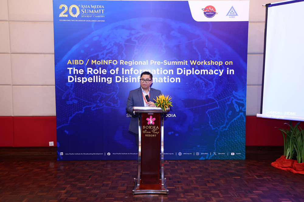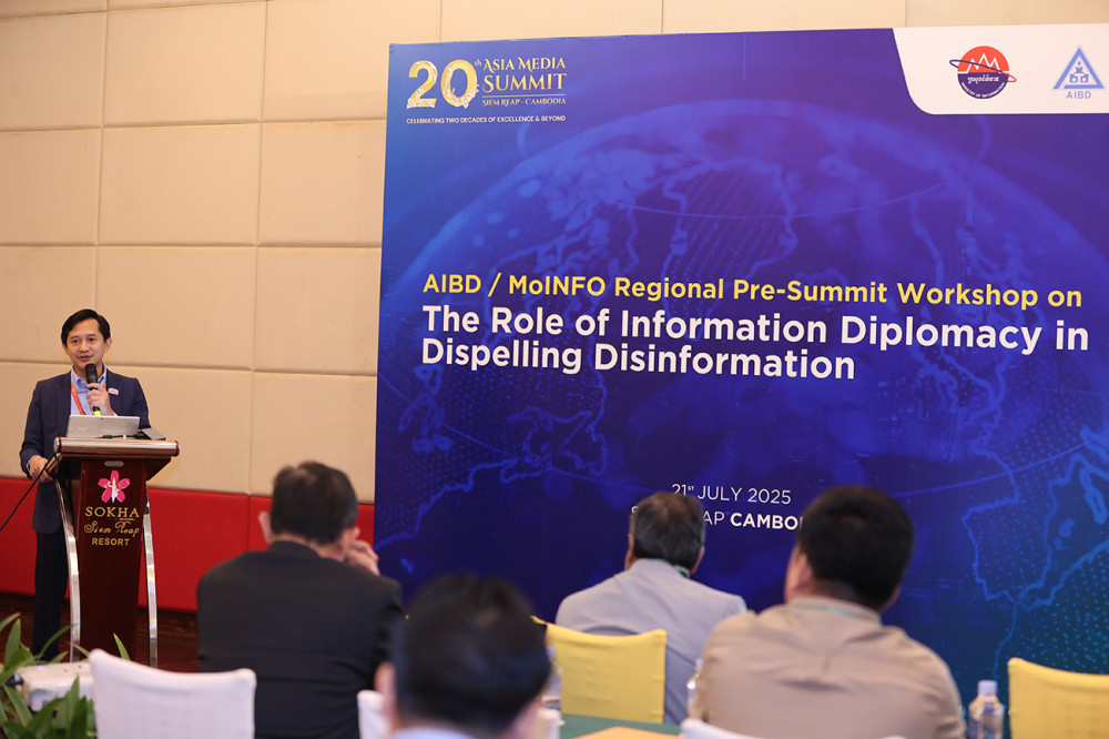 Under Secretary of State at the Cambodian Ministry of Information H.E. Prak Thaveak Amida (Pic. 1) delivers his remarks while he was presiding over a Workshop on the Role of Information Diplomacy in Dispelling Disinformation, opened this morning in Siem Reap provincial city as part of the 20th Asia Media Summit hosted by Cambodia from July 21 to 24.