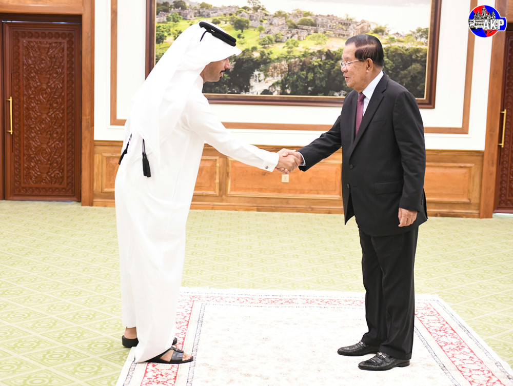 Samdech Akka Moha Sena Padei Techo Hun Sen (R, Pic. 1), President of the Senate of the Kingdom of Cambodia, greets Mr. Fahd Al Dosari, Special Advisor and Head of Public Relations of AMH company, who leads a delegation from two Qatari investment companies—AMH and LCH Investment Group Co., Ltd., prior to a courtesy meeting, at the Senate Palace in Phnom Penh this morning.